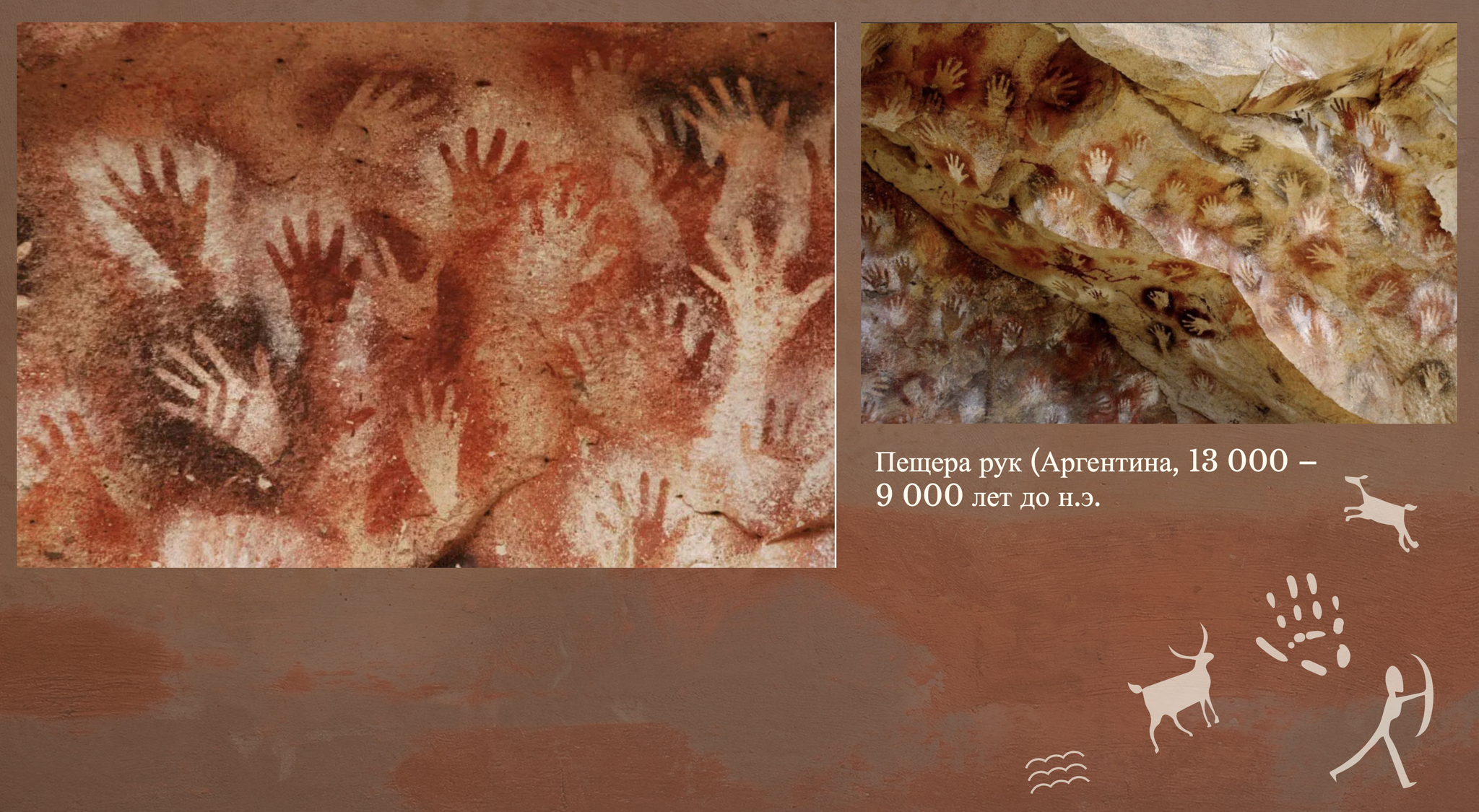 Пещера рук (Cueva de las Manos) . Здесь обнаружено около 800 отпечатков ладоней, выполненных в технике трафарета: человек прикладывал руку к скале и распылял пигмент через костяную трубку.