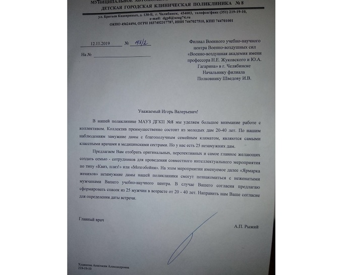 Челябинский главврач детской поликлиники №8 Антон Рыжий написал письмо в ЧВВАКУШ, в котором он пригласил неженатых курсантов прийти на вечер знакомств с симпатичными девушками — медиками 8 поликлиники. Как сообщает сайт "Хорошие новости Челябинской области" кодовое название вечера «Ярмарка женихов», и главная цель организаторов — познакомить одиноких медсестер и врачей со свободными и статными военными.