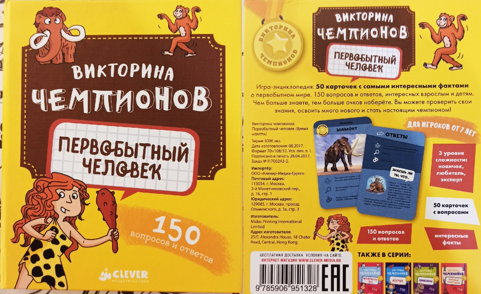 Увидев на «Озоне» набор карточек «Первобытный человек» из серии «Викторина Чемпионов» издательства CLEVER, мы тут же заказали его. Красивая коробка обещает 150 вопросов и ответов, с помощью которых вы сможете «проверить свои знания и стать чемпионом!». Надо добавить, что этот набор переведён с французского, автор текста Патрик Дэвид. Наверное, для перевода выбрали что-то действительно достойное?