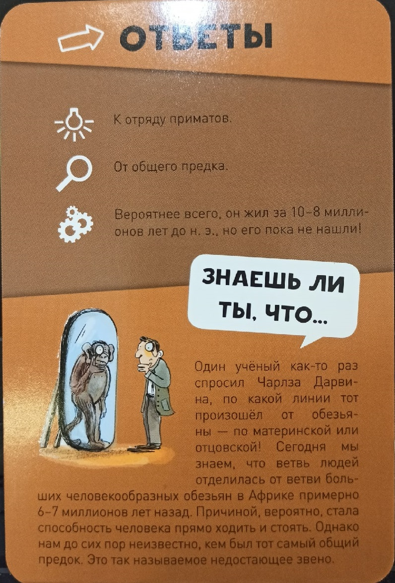 Увы, оптимизм мой стал быстро убывать, когда на первой же открывшейся карточке я прочитал: «Один ученый как-то раз спросил Чарлза Дарвина, по какой линии тот произошёл от обезьяны – по материнской или отцовской?» Вообще-то эту реплику приписывают епископу Сэмюэлу Уилберфорсу, и адресовал он свой вопрос Томасу Гексли. Один из оппонентов тут, как видим, не учёный, а второй – не Дарвин, но зачем это на детских карточках «игры-энциклопедии»? Может быть, дальше мы прочитаем знаменитый, искромётный ответ Гексли епископу? Нет, вместо этого карточка сообщает лишь, что «нам до сих пор неизвестно, кем был тот самый общий предок. Это так называемое недостающее звено». У-у-у. Скучно, господа!