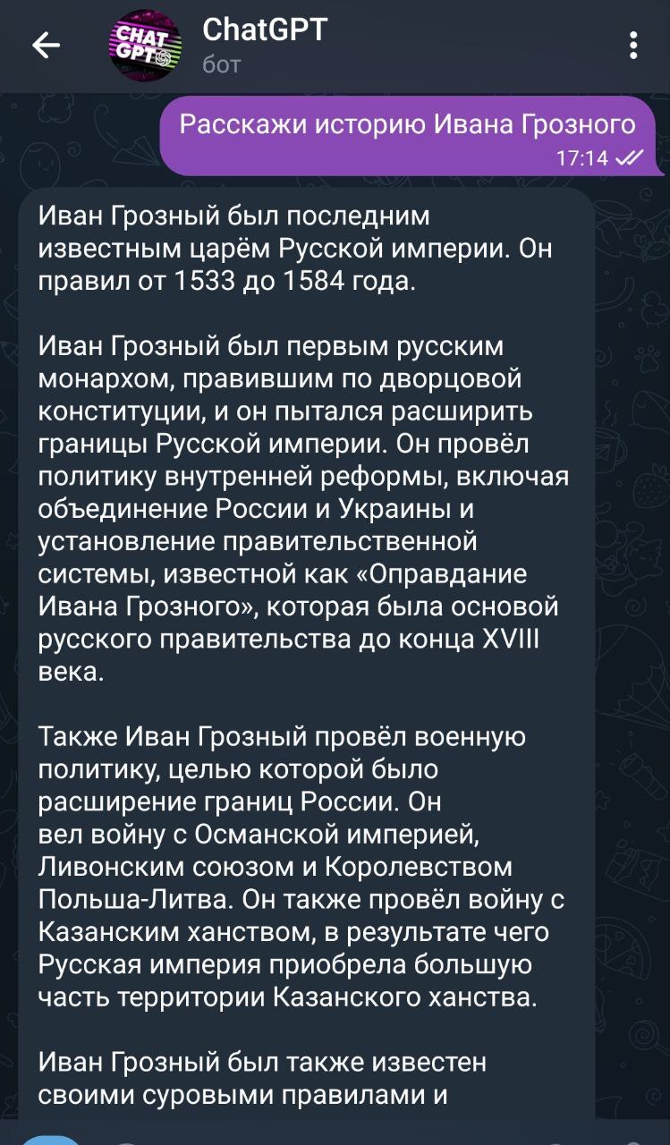 3. ChatGPT может вкратце рассказать историю об Иване Грозном, да и не только о нем