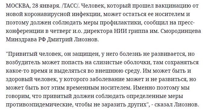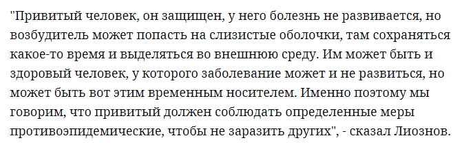 Прививка, однако, не защищает от вируса, а только делает течение болезни лёгким. При этом привитый так же может переносить и распространять вирус, как и не привитый