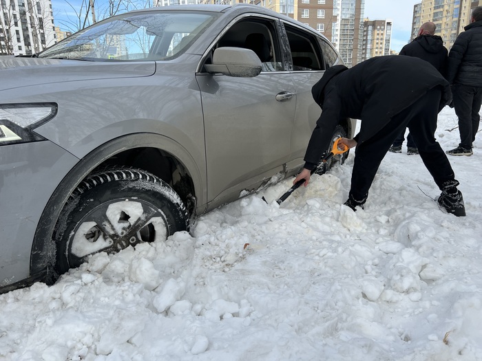 Вот вроде весна, а мы вовсю машем снеговой лопатой. Очищаем площадку перед Haval, чтобы он имел возможность задавать траекторию движения. На часах 13:00, водитель копает как экскаватор. Он еще надеется успеть добраться к 14:00 за город на встречу.