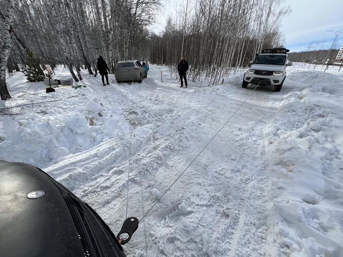 Mercedes-Benz ML пытается выдернуть Haval динамическим (рывковым) тросом, но его сдергивает в сугроб. Оставляем эти попытки, чтобы окончательно не испортить путь по которому нам всем еще выезжать.