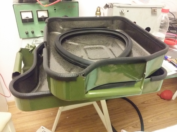 При помощи жены болгарина, дремеля и ножовочного полотна, канистра была располовинена, после чего выкрашена изнутри молотковой эмалью (антуражно, да и в кладовке пол банки завалялось) и край закрыт уплотнителем.