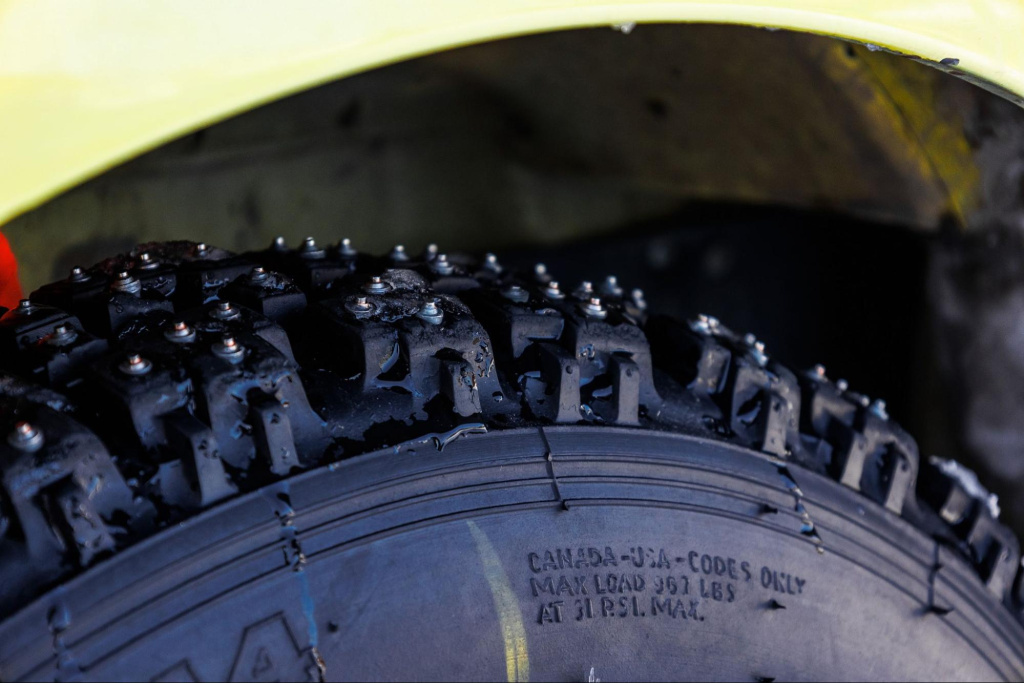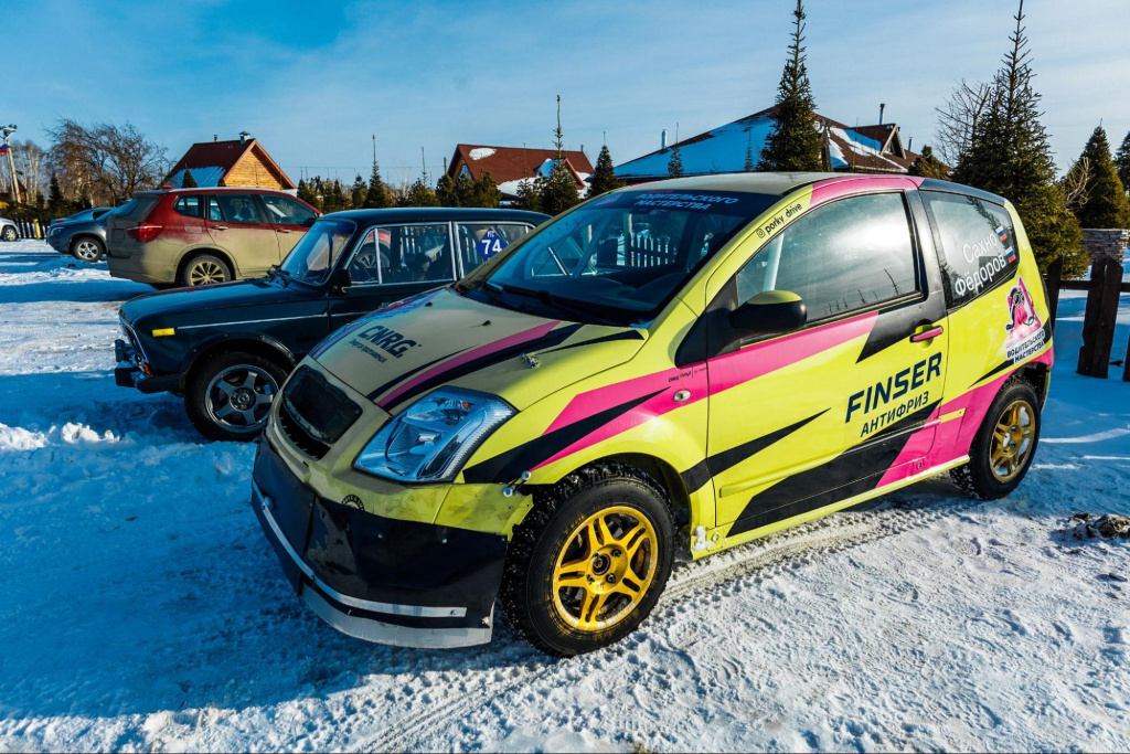 В салоне от привычной машины не осталось почти ничего — все внутренности заменены на специализированные и профессиональные: гоночные кресла с обтекаемой спинкой, железный каркас и максимально надежные пятиточечные ремни безопасности. На колесах красуются необычные тренировочные шины со спортивными шипами для лучшего сцепления со льдом.