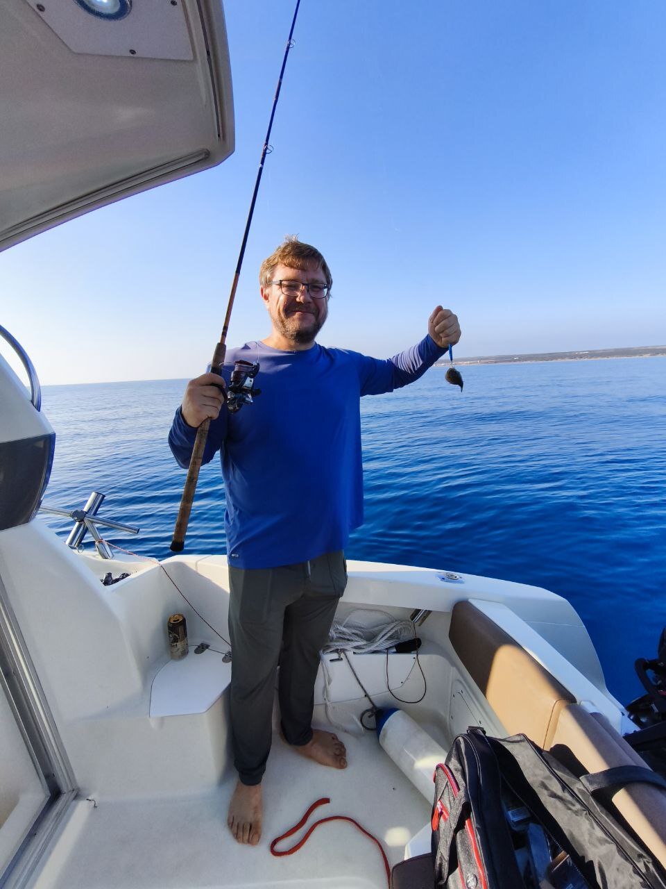 Минут за 15-20 мы справились с тремя тунцами и встали на курс к бую. Сидим, радуемся победе и вдруг лодка резко замедляется и Руслан, наш капитан и владелец лодки, говорит, что впереди что-то странное и большое. Хватаю телефон и поднимаюсь на борт, пытаюсь снять, что же там такое. И видим кита! Потом уже определили, что это южный малый полосатик. Крайне редкая встреча для наших вод. Я уже несколько лет рыбачу в средиземном море и о китах до этого только пару раз слышал.
