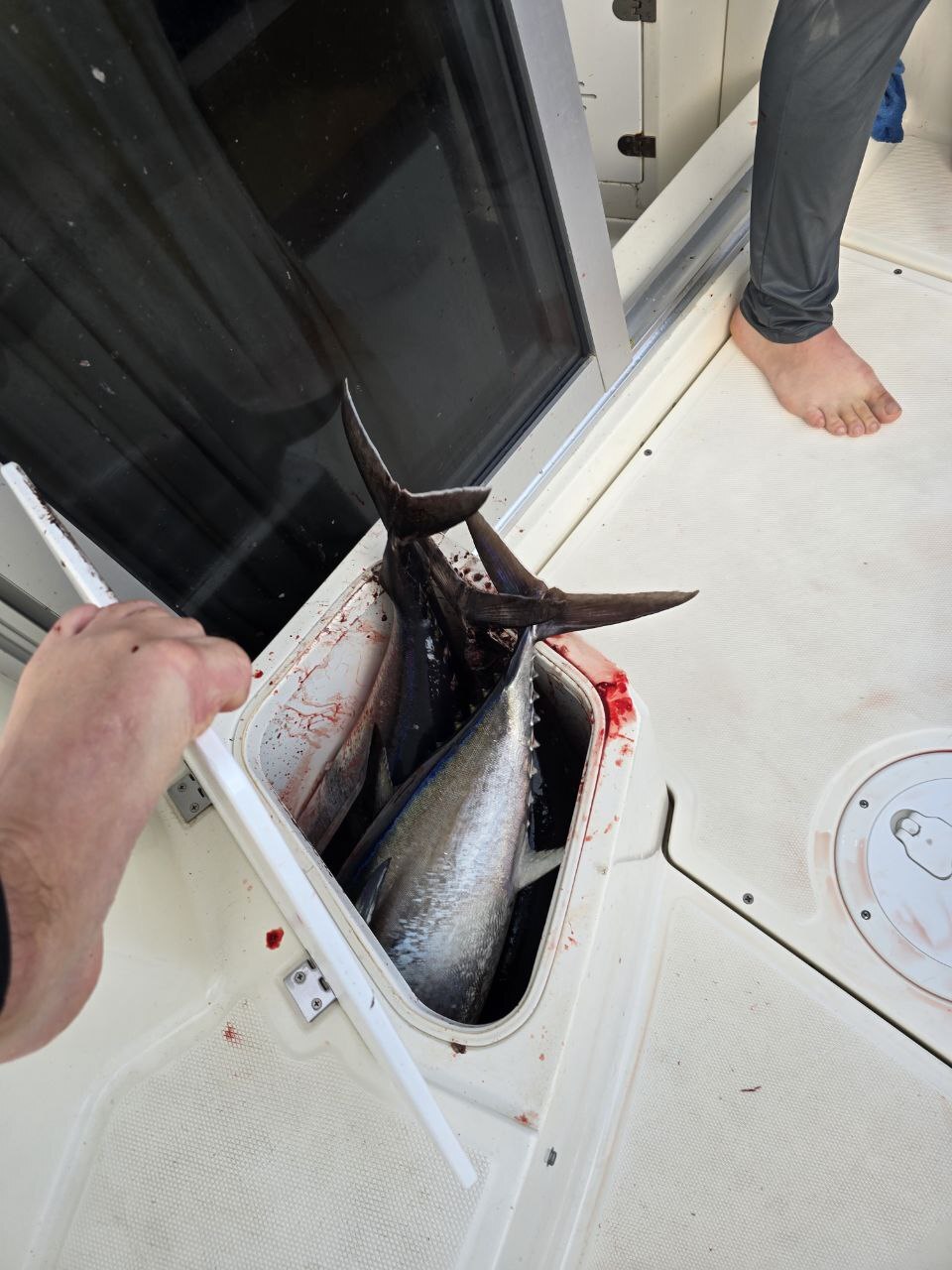 Примерно к 4:30 как-раз и подошли к рыбным точкам, выставили снасти и начали троллить. В районе 5 утра по рации сообщили, что одна лодка уже закрыла лимиты и ушла пить пиво, ждать замеров и ловить ханоса и прочую мелочь на буе. Мы же упорно продолжали. Где-то в 6:00 решили сменить одну снасть с поверхностного кальмара на Bluewater. Выставились снова и в 6:15 зажужжала трещотка именно этой снасти. Т.к. на катушке было достаточно запаса - решили не сбавлять ход сразу и пройти ещё немного на 5.5 узлах. И не зря - буквально через 20 секунд услышали треск ещё двух катушек. Сбавили ход до 1.5 и начали вываживание.