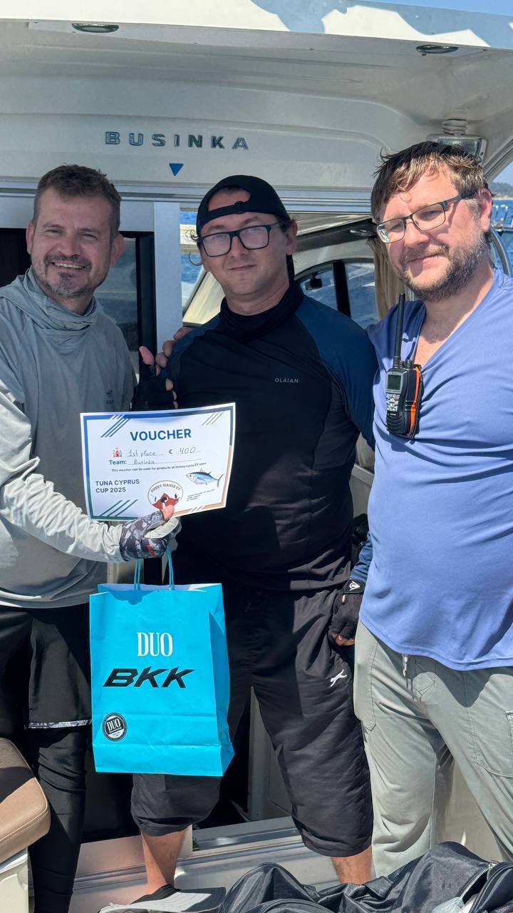 За победу дали сертификат на 400 евро в рыболовный магазин и пакет снастей, там было 2 очень хороших тунцовых воблера, куча карабинов, колец и прочей полезной рассыпухи, открывашка (необходимая на лодке вещь) и разного рода мерч.