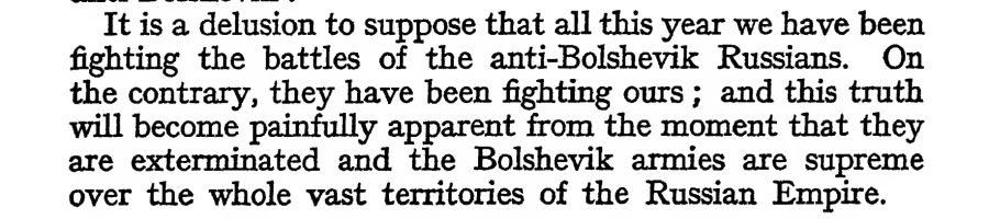 "It is a delusion to suppose that all this year we have been fighting the battles of the anti-Bolshevik Russians. On the contrary, they have been fighting ours; and this truth will become painfully apparent from the moment that they are exterminated and the Bolshevik armies are supreme over the whole vast territories of the Russian Empire."
