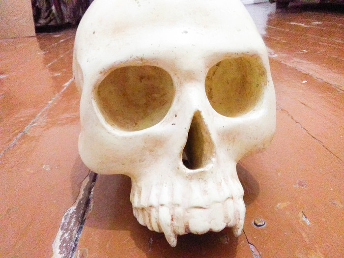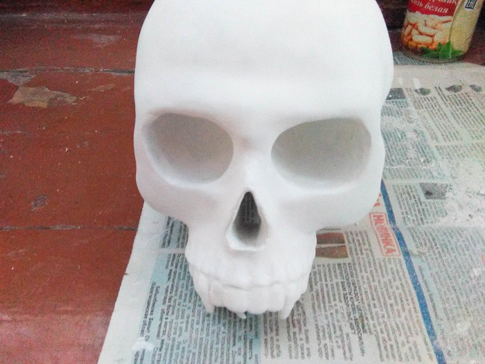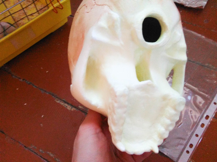Череп, как вы поняли, полый. И было бы тупо, если в глазницах бы виднелась вся внутренняя полость. Из пластилина был изготовлен.... Ммм... Не то шар, не то комок... В общем, он соответствовал нужной форме внутренней полости глазницы. Для этого нижняя часть черепа была отрезала. Так вот, поверх пластилинового шара была уложена масса папье-маше. После высыхания разрезана на две половинки, снята, аккуратно склеена назад и на горячий клей впаяна непосредственно на место. Ну и со второй глазницей та же история. Пришлось только немного форму изменить.