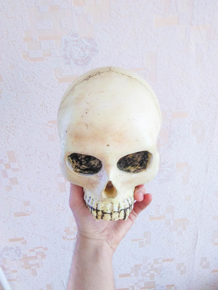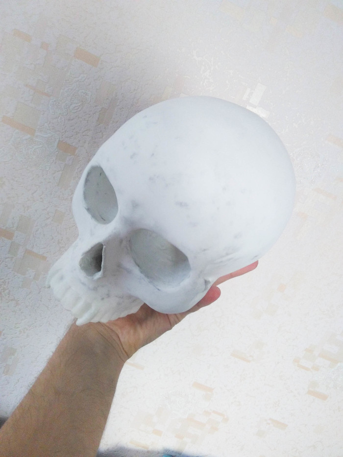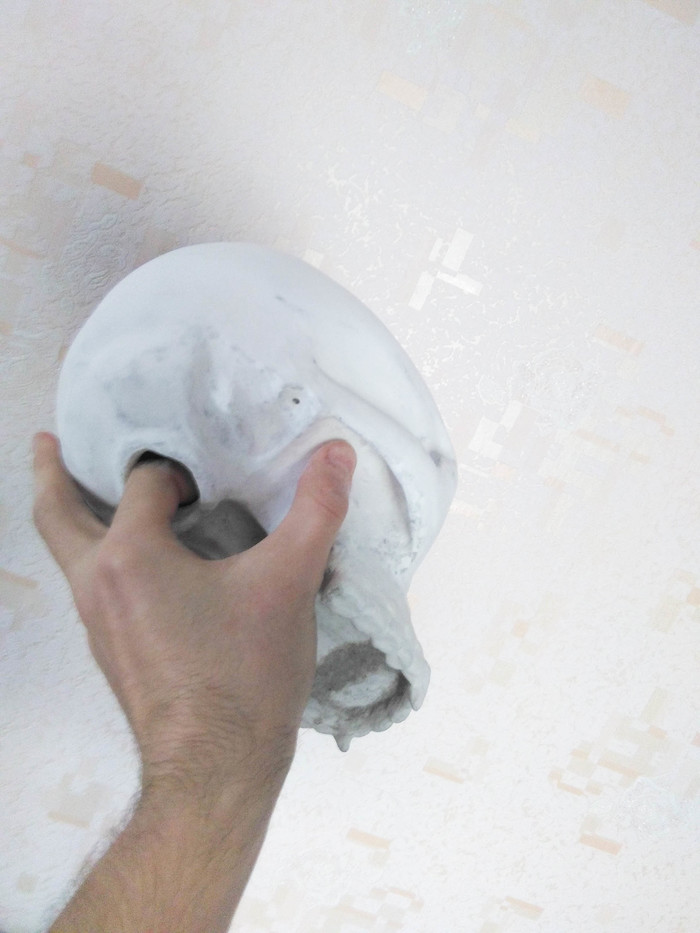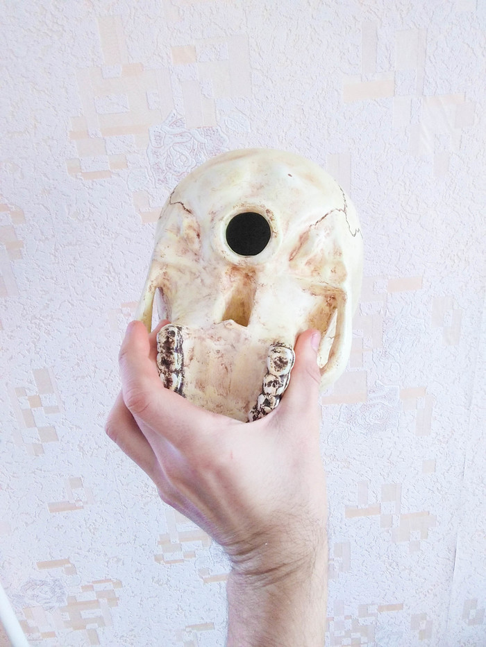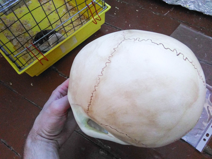 Воооооот. Чтобы максимально приблизиться к анатомически верному виду черепа в нижней части было проделано отверстие под спинной мозг с первым впаянным в череп позвонком. Понятия не имею как это называется в медицине. Также просверлен сквозной канал для носового отверстия и вообще всю нижнюю часть попытался привести в надлежащий вид. Насколько это было возможно с папье-маше.