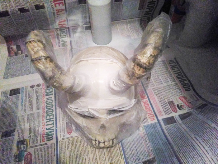 Самое время создать рога. Берём дома ненужный хлам - и вуаля! Ладно, шучу... Берём проволоку, гнем обе нужной формы. Чтобы были как в зеркальном отражении. Режем старые ненужные пакеты на полоски и с помощью скотча и такой - то матери создаём форму рожек. Затем спиралькой бумажку свернутую в жгутик по всей длине. Это чтобы получились "вьющиеся" рога. Можно верёвку, но у меня её не оказалось. Идём более сложным путём. Сверху салфетки с пва.
