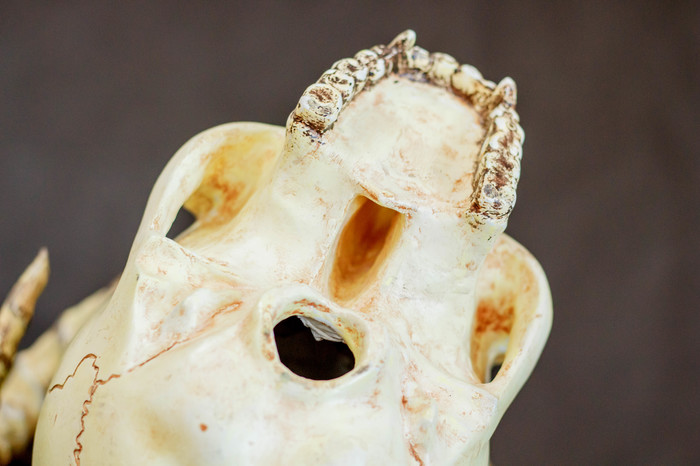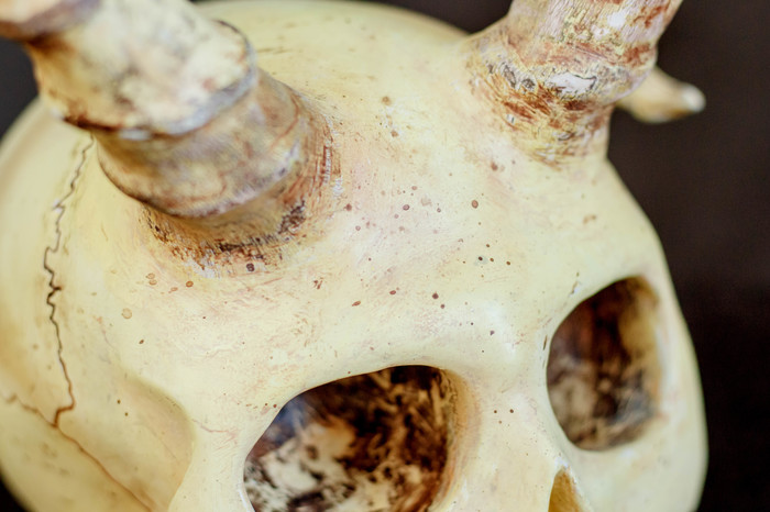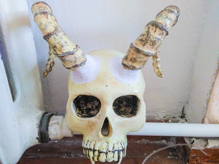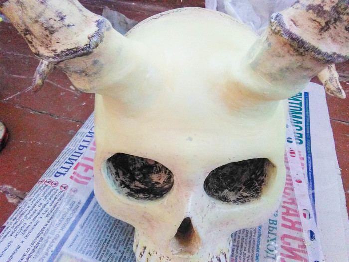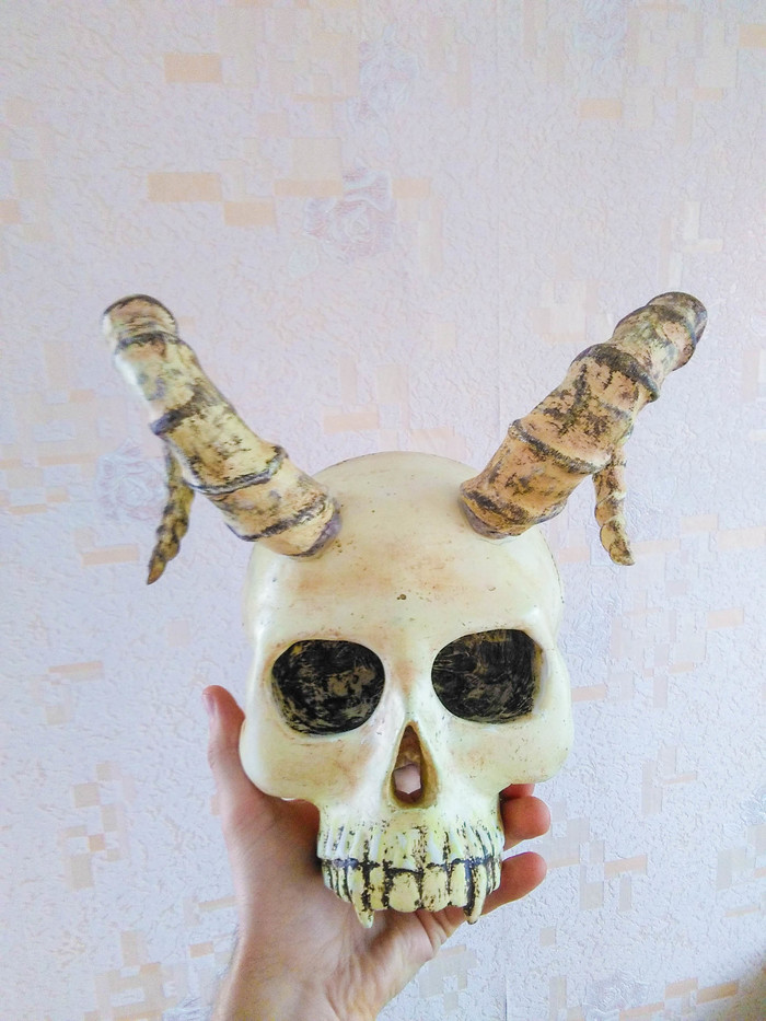 Череп готов, самое время приделать ему рога. В общем, тут всё просто. Берём горячий клей - и соединяем. Сами рога после грунтовки были хорошенько так пошорканы средней наждачкой. Этим я создавал эффект волокнистости рогов. Дальше как с черепом. Красим светло желтым. Затем светло коричневым для малого затенения углублений. И в конце темно коричневым. Он попадает в порезы от наждачка, усиливая эффект волокнистости.