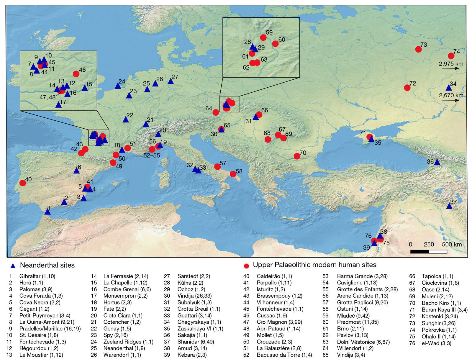 Рис. 2. Местонахождения неандертальцев (синие треугольники) и верхнепалеолитических сапиенсов (красные кружки), учтенные в обсуждаемой статье. Для каждого местонахождения в скобках указано число образцов (индивидов) и «скелетных элементов», то есть отдельных крупных черепных костей. Считается, что полный череп состоит из 14 «скелетных элементов». Изображение из обсуждаемой статьи в Nature