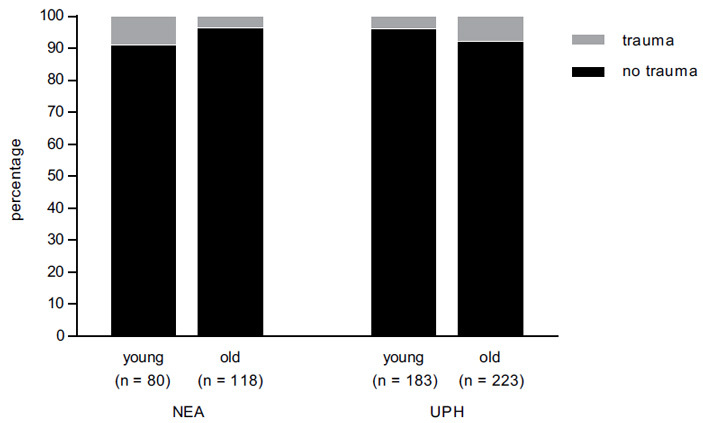 Рис. 3. Доля «скелетных элементов» со следами травм у «молодых» (young) и «старых» (old) неандертальцев (NEA) и верхнепалеолитических сапиенсов (UPH), без учета образцов неопределенного пола или возраста. Рисунок из обсуждаемой статьи в Nature