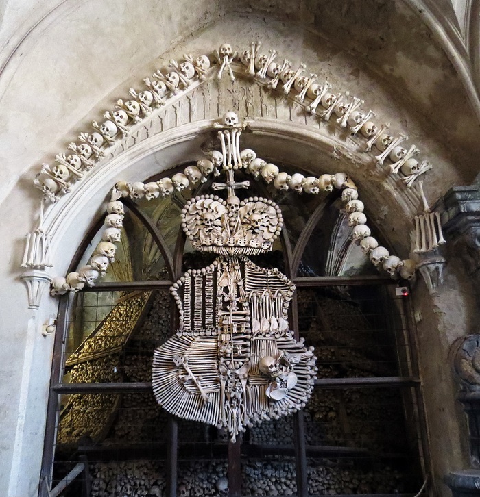 В один из выходных дней выбрались с коллегами в Кутна Гору, городок километрах в 60 от Праги. Я много слышала о Костнице, но до сей поры не добиралась до этой достопримечательности. Интерьер Костёла Всех Святых, полностью отделан человеческими черепами и костями, для оформления которого было использовано около 40 000 человеческих скелетов. История весьма любопытна: некий аббат был отправлен на Святую землю чешским королем. Вернувшись, он привез немного земли с Голгофы и рассыпал ее по аббатству. С тех пор аббатство стало популярным местом захоронения усопших со всей Центральной Европы. Места стало не хватать и решено было раскопать могилы (!!) извлечь останки, пустить их на отделку костела, а освободившееся место снова использовать как кладбище уже для новых могил. Зрелище, конечно, впечатляющее