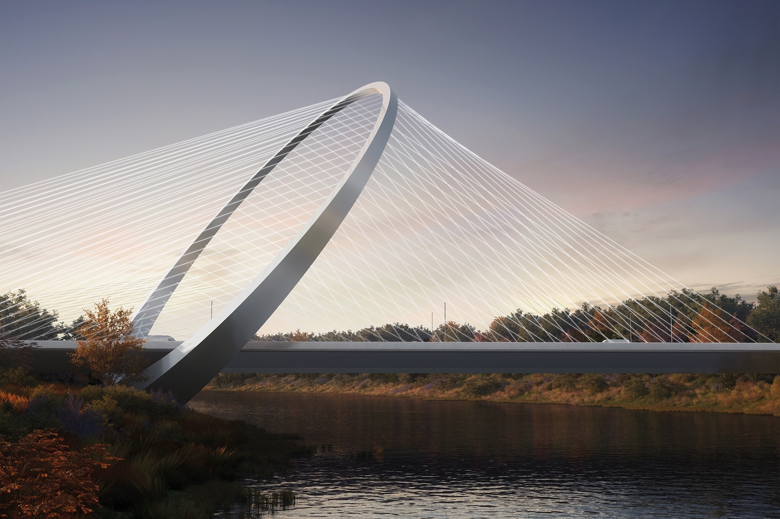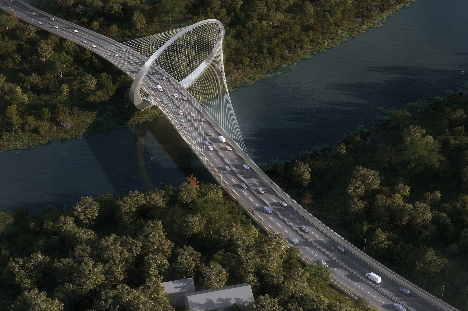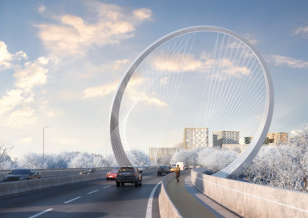 Ванты будут закреплены на пилоне кольцеобразной формы. Длина моста составит 390 метров с подходами, на нем организуют по две полосы движения в каждом направлении. Строительство должно завершиться до конца 2027 года.