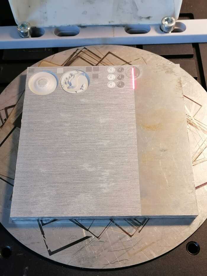 И как ты не грей лазером поверхность алюминия, эта пакость будет либо разрушаться при гравировке, либо немного темнеть при маркировке, но никогда не окрасится в многими желанный черный цвет. Максимум в какие-то темно-серые тона.