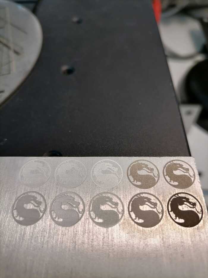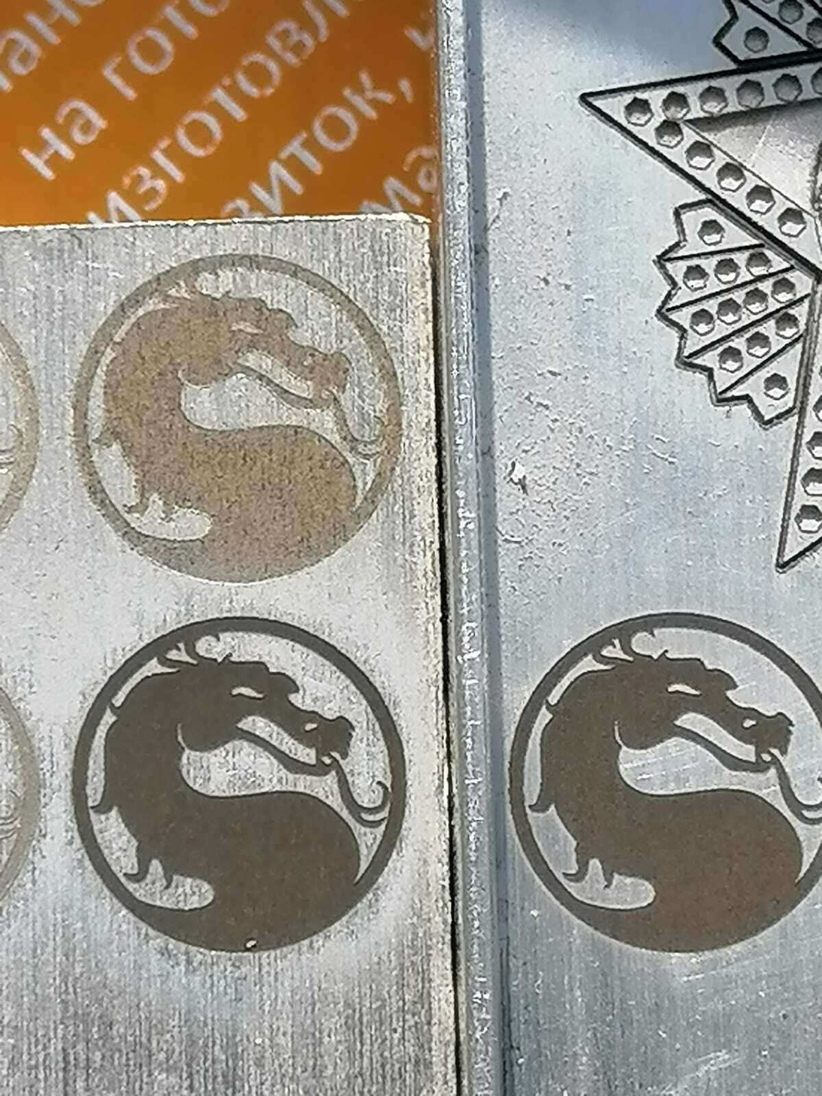 Верхний ряд - испытания на линзе F330 (рабочее поле 200х200 мм). На первые 3 эмблемы слева можете не особо обращать внимания, это гравировка, потом гравировка с чисткой и гравировка с чисткой и полировкой.