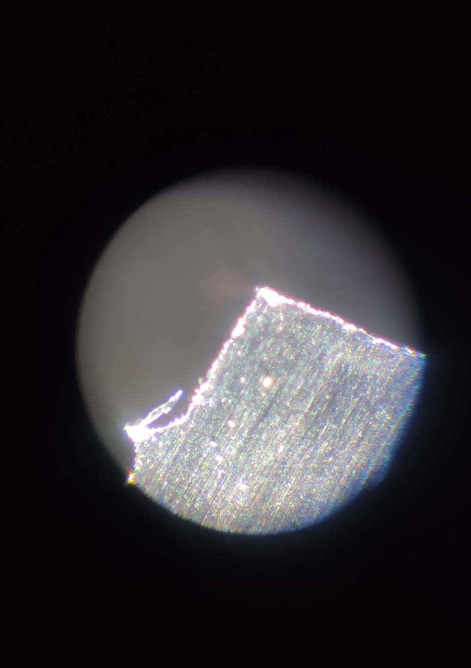 6 OrcUraloid Черновой рез электроэррозия Серия Работа на EDM станках. 1 год назад Так выглядит рез проволки под небольшим увеличением. Ширина реза примерно 0.28 - 0.3 мм, сама проволка 0.25мм. Место остановки реза, заход с правой стороны, 2 прохода. Конус место обрыва детали из заготовки. [моё] Мобильная фотография Работа Длиннопост Ещё 0