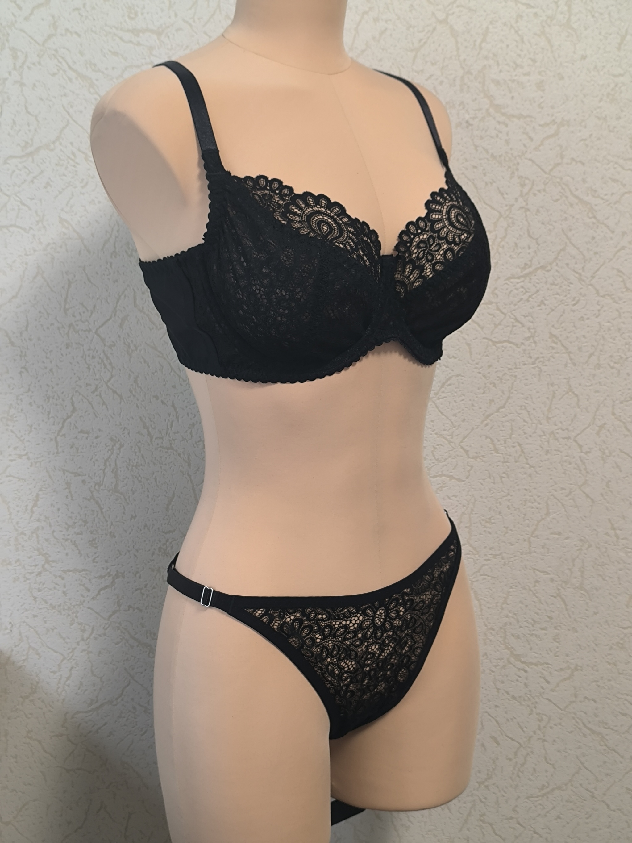 Сегодня у нас комплект из кружева. Бюстгальтер на косточках, стринги на регулируемых бретелях. Низ чашек изнутри продублирован неэластичной сеткой. Пояс широкий и достаточно тугой, чтобы обеспечить хорошую поддержку груди.