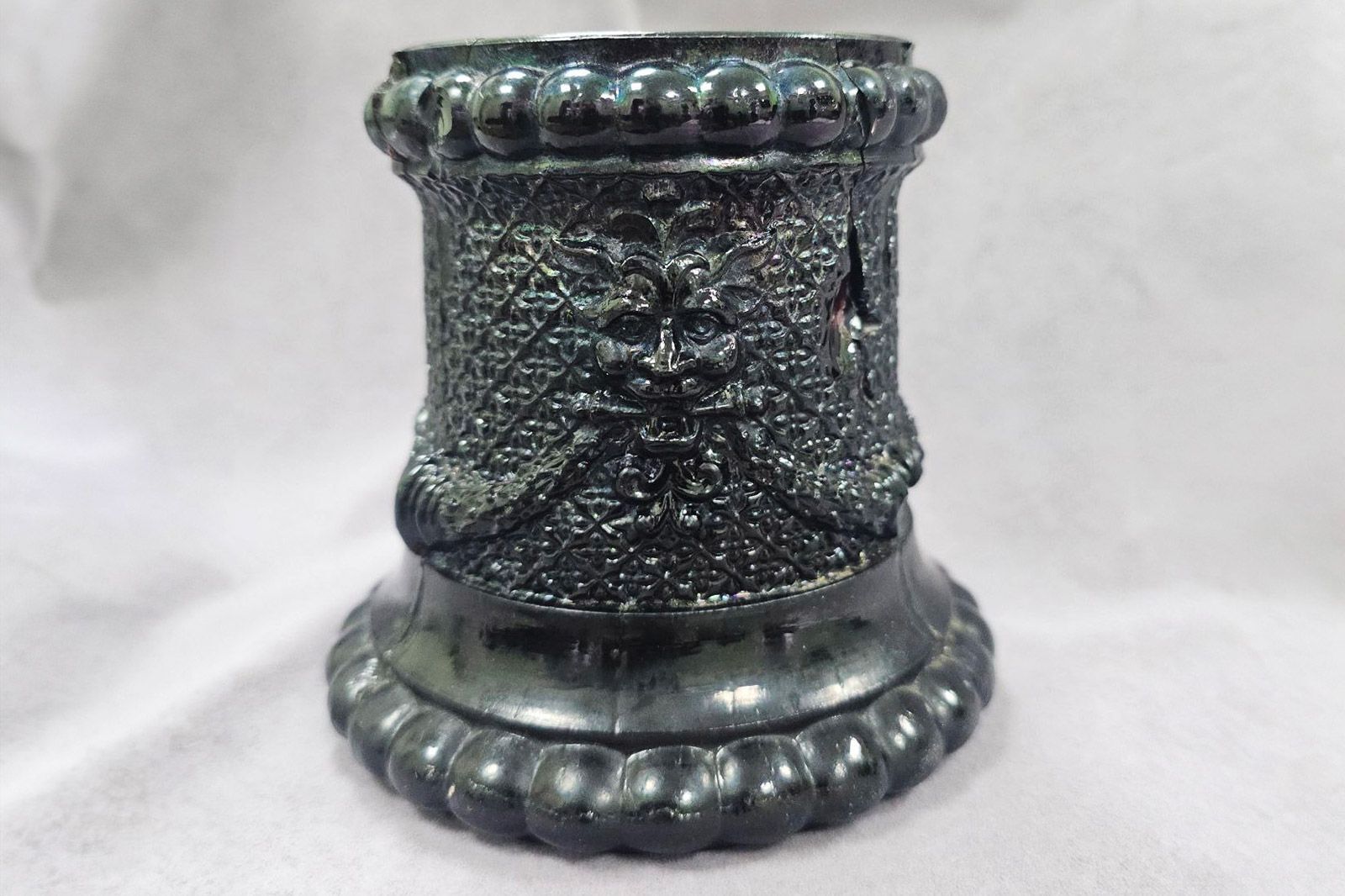 Необычный артефакт нашли во время археологических исследований на Фрунзенской набережной. На стенках карандашницы изображены головы чертенят, соединенные цепями, которые они сжимают в пастях.