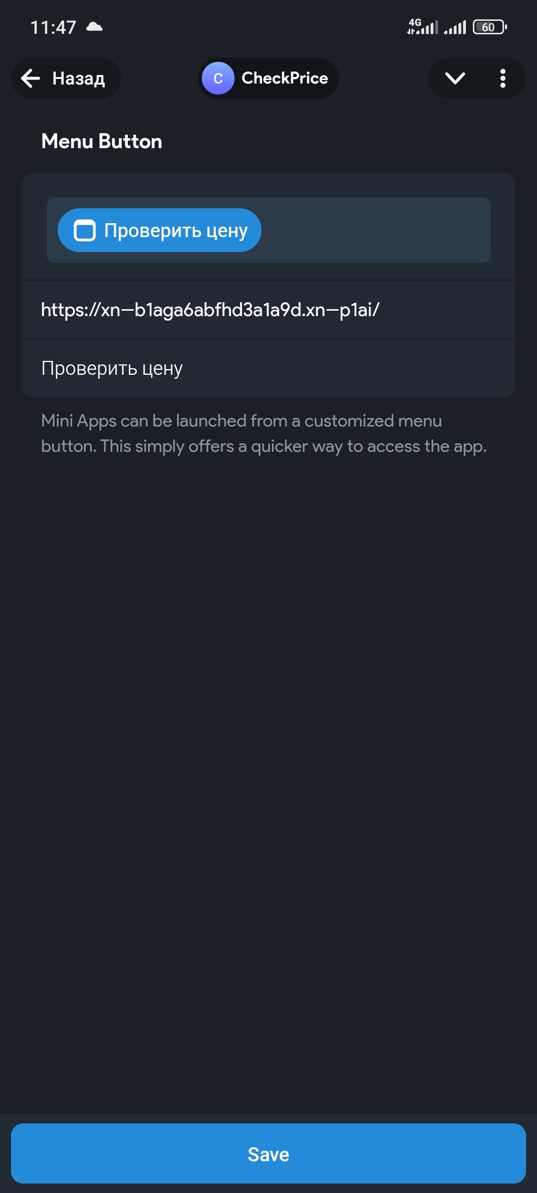 Всё сохраняется и с этого момента сайт получает гордое звание "Приложение в Телеграмм".