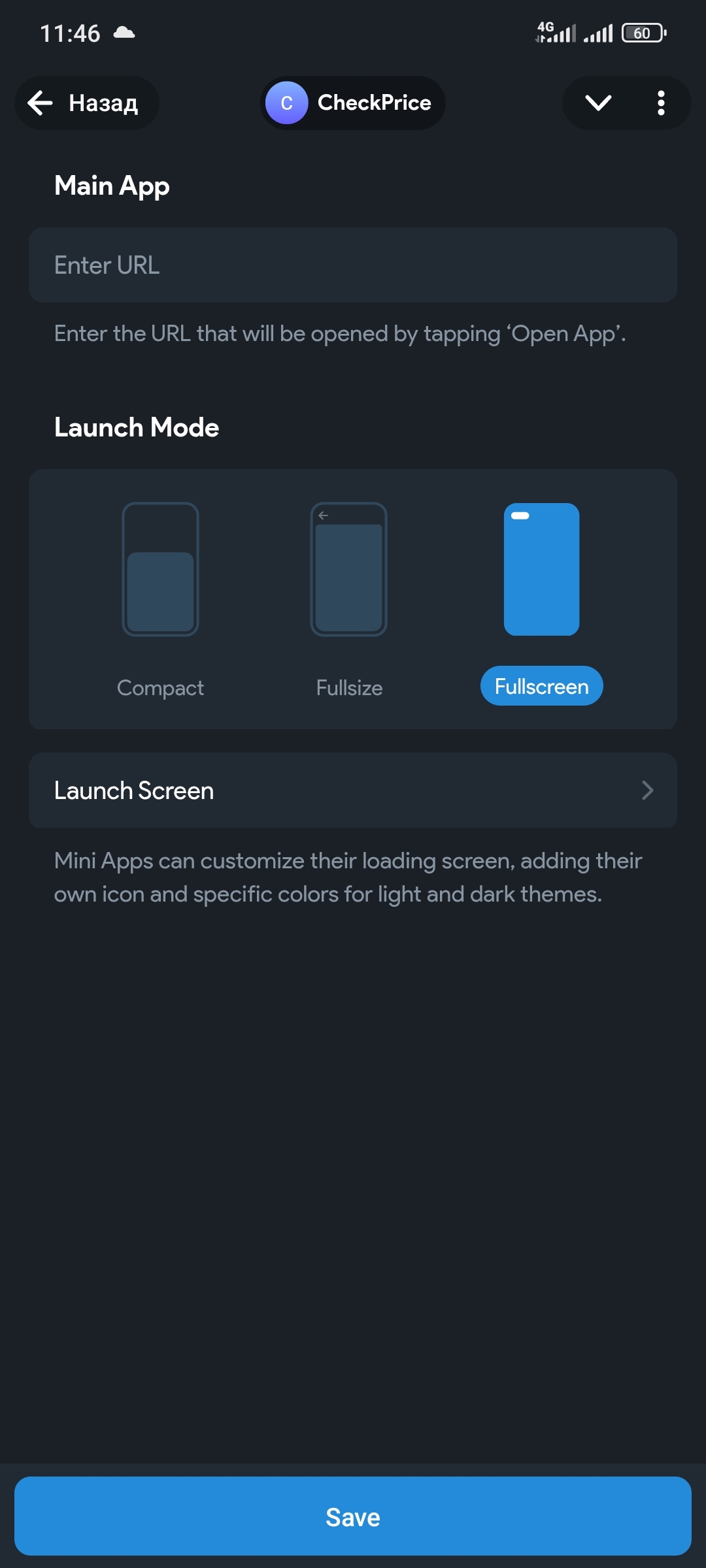 Тут публикуются ссылка на приложение и можно задать стиль запуска - часть экрана или на все пространство.