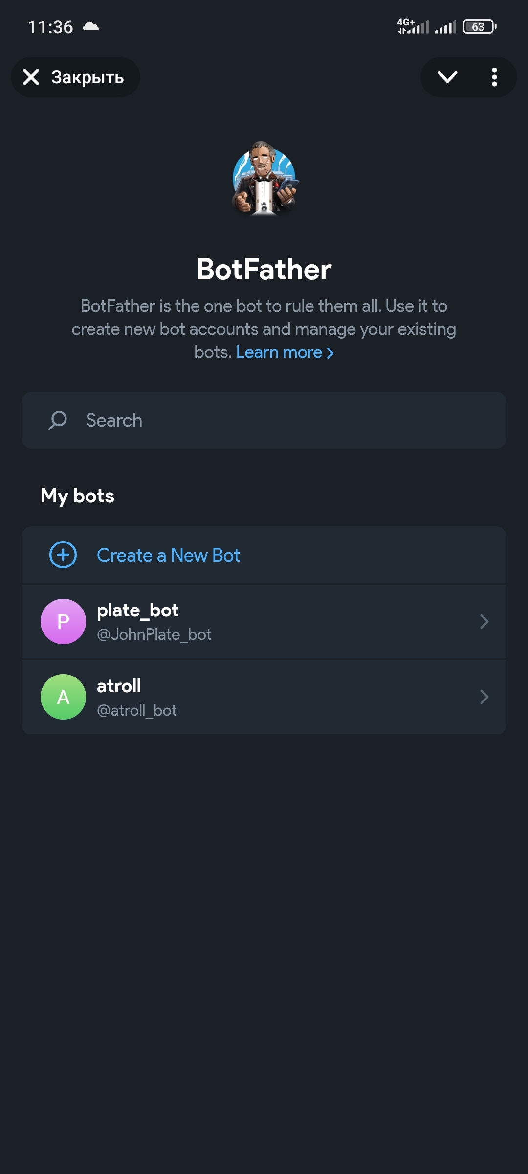 Нажимаем на кнопку создания бота "Create a new bot"