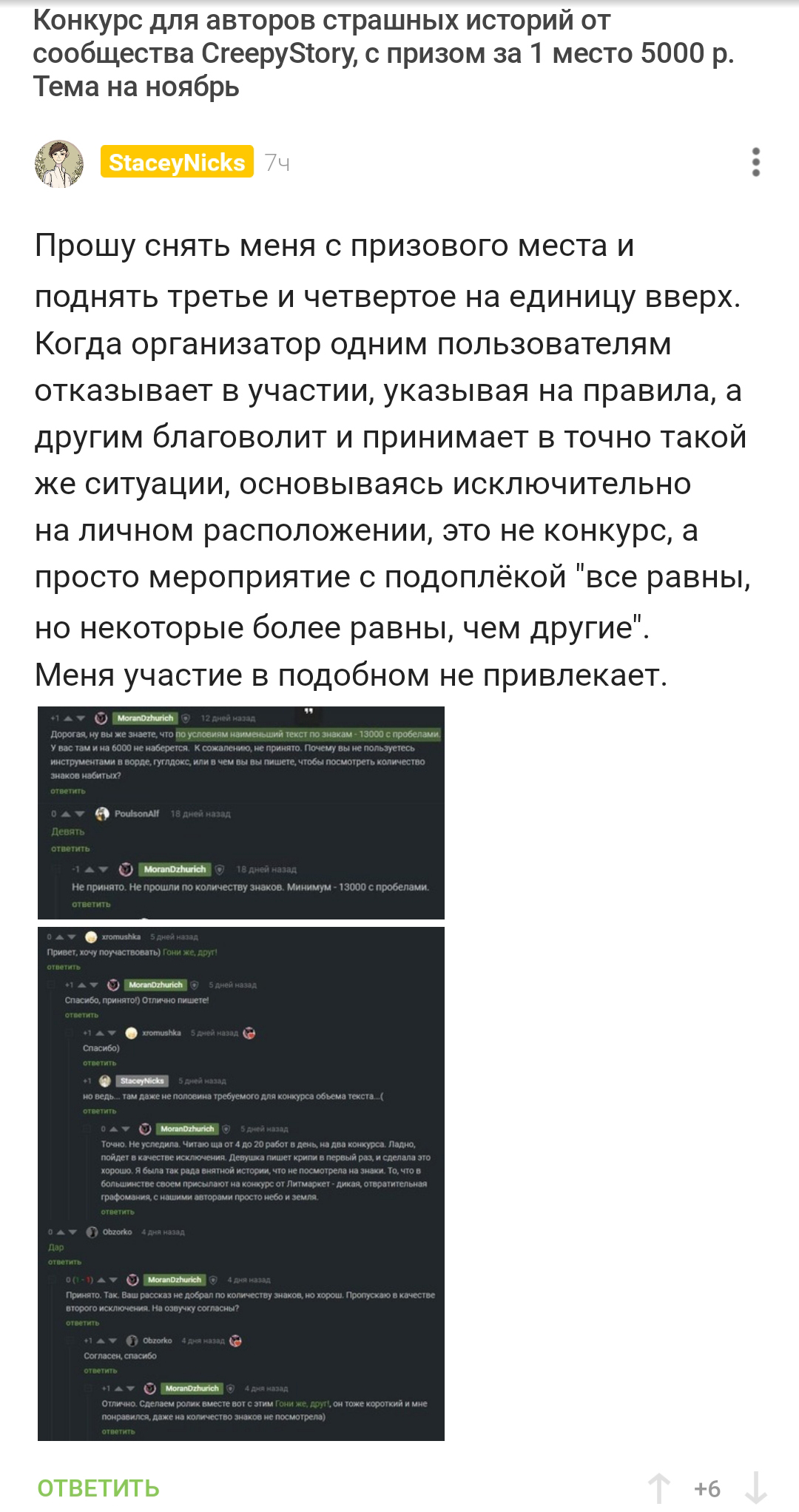 В один момент обратила внимание, что организатор @MoranDzhurich тщательно отсеивает тех, кто не проходит по заявленным к конкурсу требованиям, плюс отсеивает тех, кто по ее личному мнению не дотягивает до нигде не указанной планки, местами довольно забористо, особо не сдерживаясь и не учитывая, впервые человек участвует или нет. Однако найдя лично своих фаворитов, она свободно сделала для них исключения в правилах и приняла в конкурс, следом продолжив предвзято отсеивать других участников.