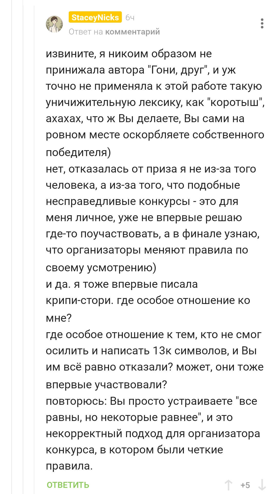 Свою позицию я обозначила более чем чётко, подкрепив конкретными примерами. И я уточню: я поднимаю эту тему не из-за денег. Не из-за ачивки. Не из-за обиды на победителя конкурса, который вообще к этой ситуации отношения не имеет. Весь вопрос заключается в нечестном судействе и в отказе отвечать за свои поступки, которые выливаются в баны, скрытие веток, перевирание всей ситуации и поливание меня помоями за глаза, когда я уже ответить не могу.