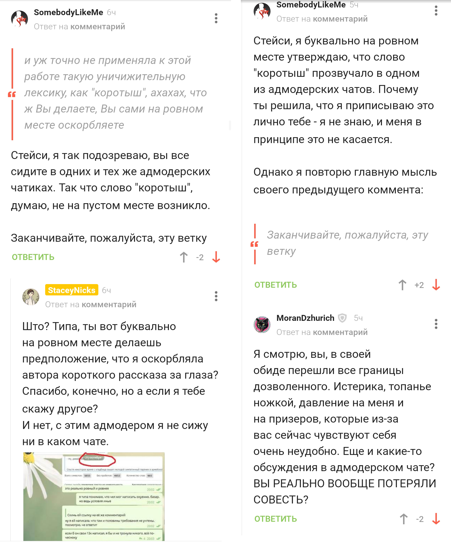 @SomebodyLikeMe, мне отчего-то казалось, что существует негласное правило "Что происходит в адмодерских чатах - остается в адмодерских чатах". Видимо, ключевое слово тут "казалось", поскольку, очевидно, была выловлена какая-то фраза из чата даже не адмодерского, просто чата людей по интересам, лишь часть актива которого - это пикабушники. Скрин или сообщения были пересланы в другой чатик, в третий - и вот уже эту информацию пытаются использовать во всеуслышание на пикабу против меня в попытке заткнуть мне рот. Неплохо.