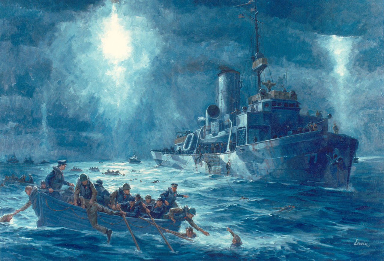 Когда я отплыл от корабля, я оглянулся. Вспышки подсветили все окружающее. Нос судна поднялся высоко вверх и ушел под воду. Последним, что я видел, были Четыре Капеллана, молящиеся вместе за наше спасение. Они сделали всё, что было в их силах. Больше я их не видел. Без спасжилетов у них не было ни единого шанса.