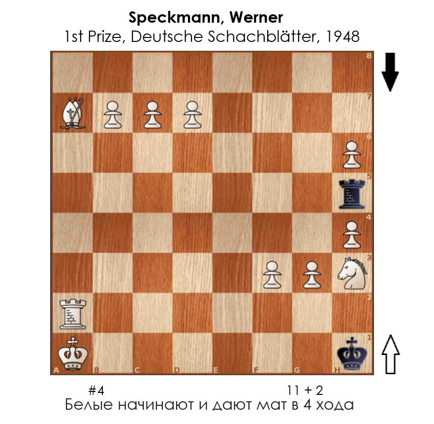 Что-то давненько не было у нас четырёхходовки, поэтому вот: композиция немецкого шахматного композитора Вернера Шпекмана (Werner Speckmann, 1913 - 2001), взявшая первый приз турнира шахматной газеты "Deutsche Schachblätter" в 1948 году.