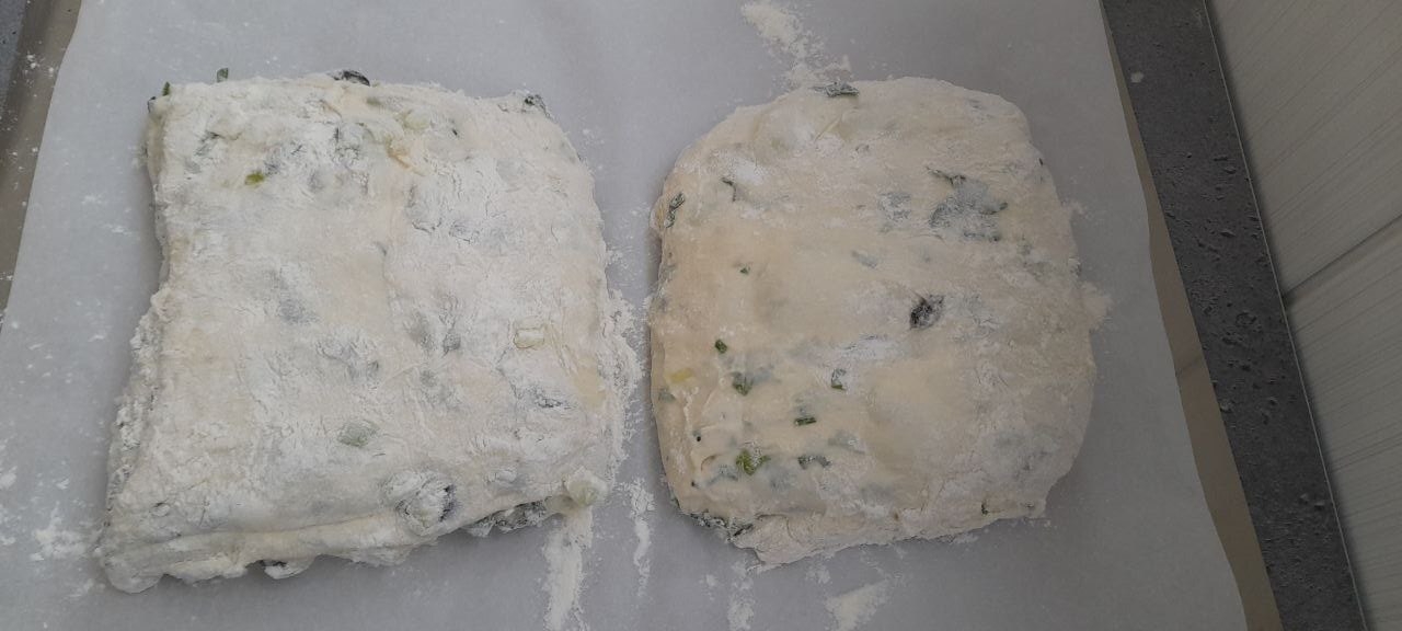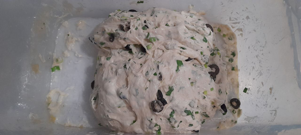 Маслины, лук, петрушку порезать. Всё смешать в одном контейнере, оставить в тепле.Три раза с интервалом в 45 минут складывать тесто пополам с каждой стороны. Затем на 1 час в холодильник и еще раз сложить. Оставить в холодильнике на ночь.