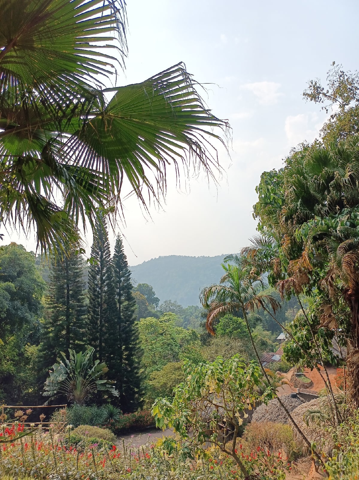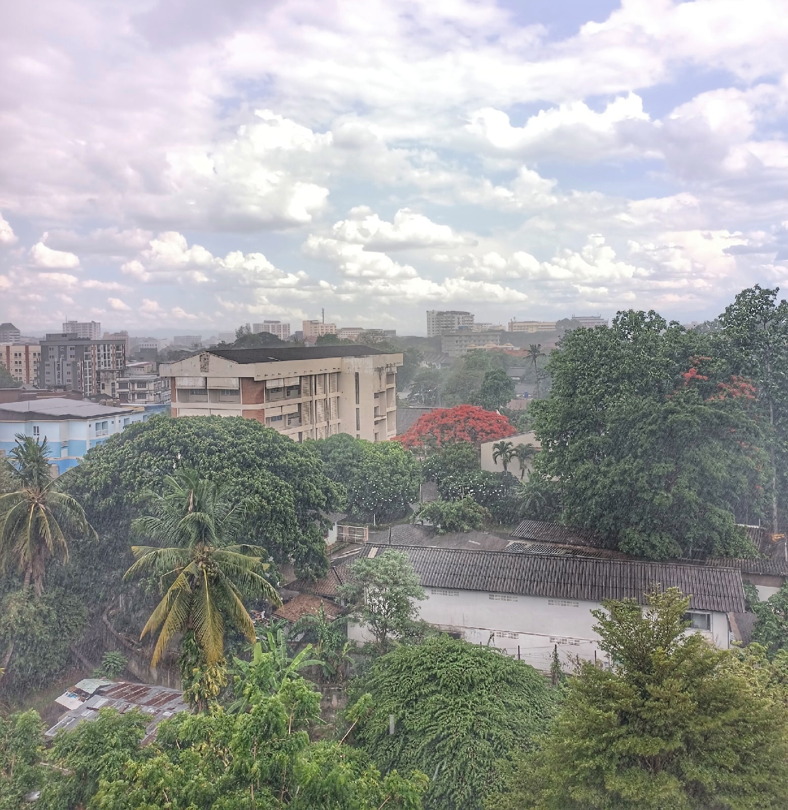 А сам город тонет в зелени, она тут кругом, два десятка горшков с цветами и пара-тройка аквариумов с рыбками будут стоять даже возле самой нищей халупы. Следующая фотка – вид с моего балкона во время дождя. Гора находится справа, в кадр не попала)