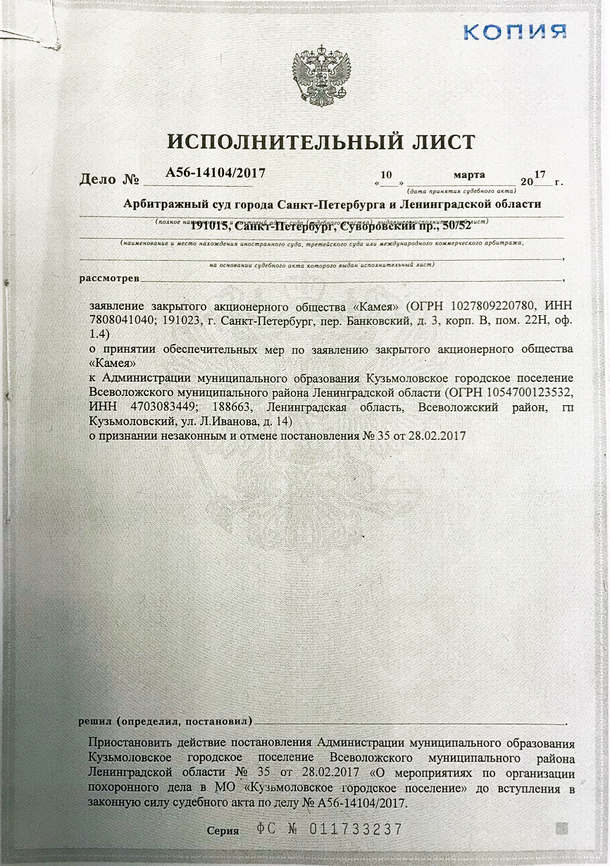 В конце февраля 2017 года администрация муниципального образования Кузьмоловское городское поселение, незаконно взяла в управление Кузьмоловское кладбище.