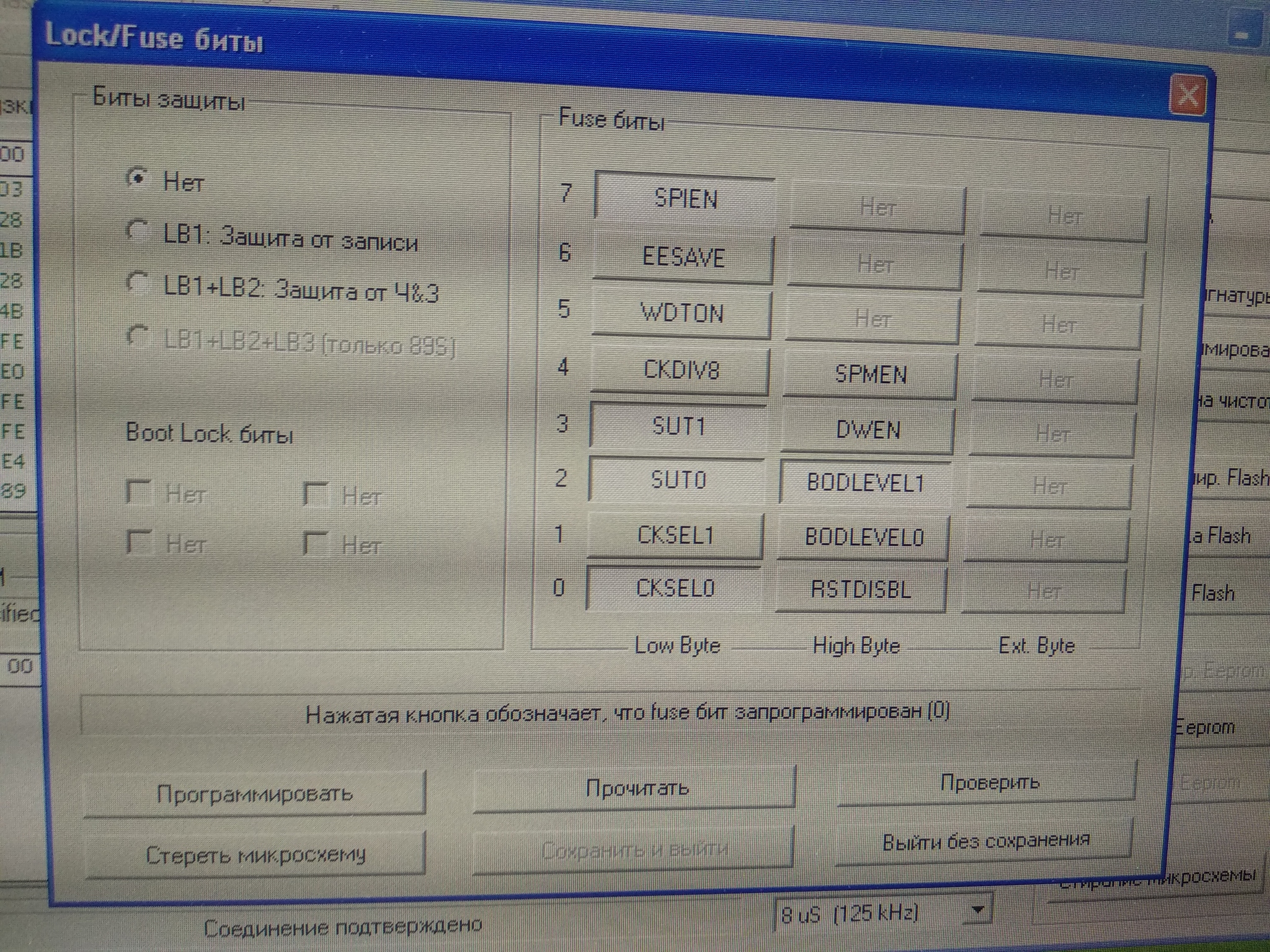 Прошиваем FUSE биты, как указал автор проекта. LFUSE=0x72 HFUSE=0xfb Это позволит переключить режим работы встроенного тактового генератора, с завода включен делитель частоты на 8, а он здесь не нужен. Для программатора Argussoft меню установки FUSE бит на фотографии: