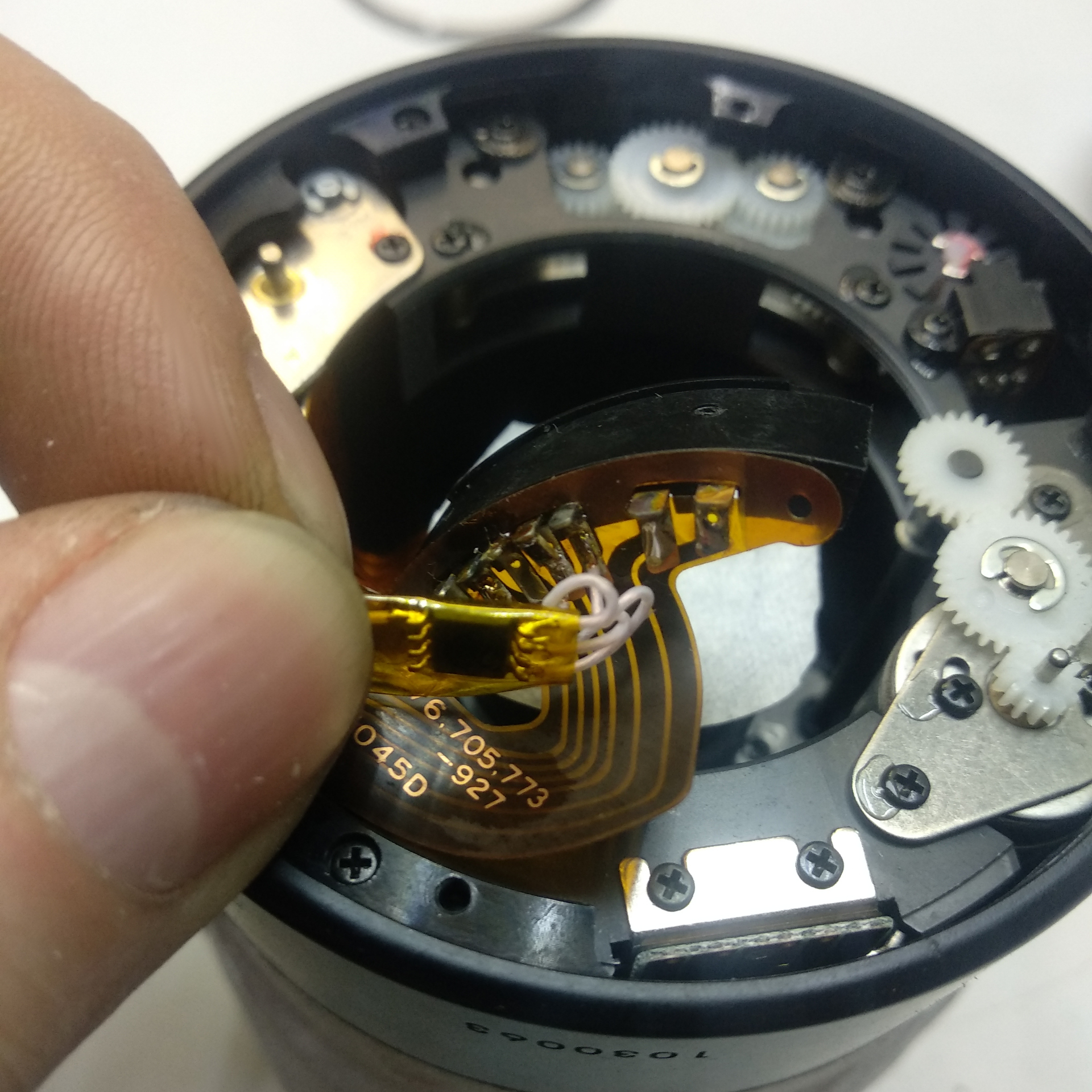 Микроконтролер отлично прячется под изгиб шлейфа. Критически важно, чтобы при работе объектива, всех его перемещениях наша модификация не мешала, иначе появится трещина и ошибка 01 уже будет из-за нарушенной связи с объективом.