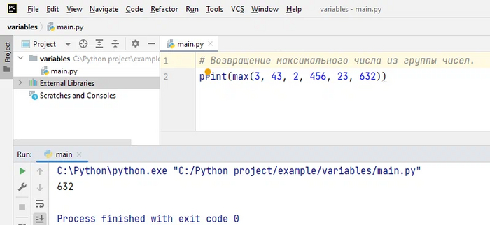 Теперь рассмотрим функцию abs, которая в качестве аргумента может принимать только одно число, эта функция отбрасывает знак, рассмотрим на примере, в качестве аргумента к функции abs передадим число -5.