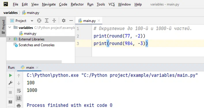 Функция round позволяет округлить число до 10-х, 100-х, 1000-х и т.д. значений. Например передав функции число 77 с шагом -2, мы округлим его до 100. Следом за ним произведем округление числа 984 с шагом -3, получим - 1000.