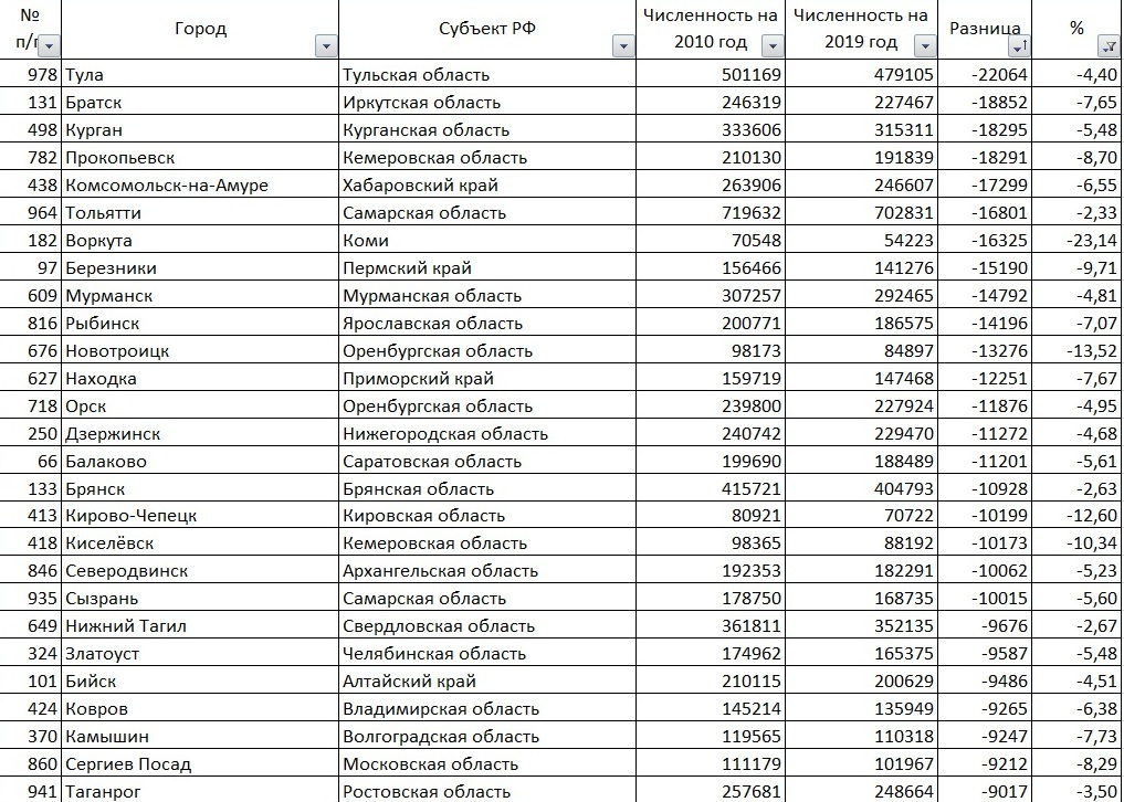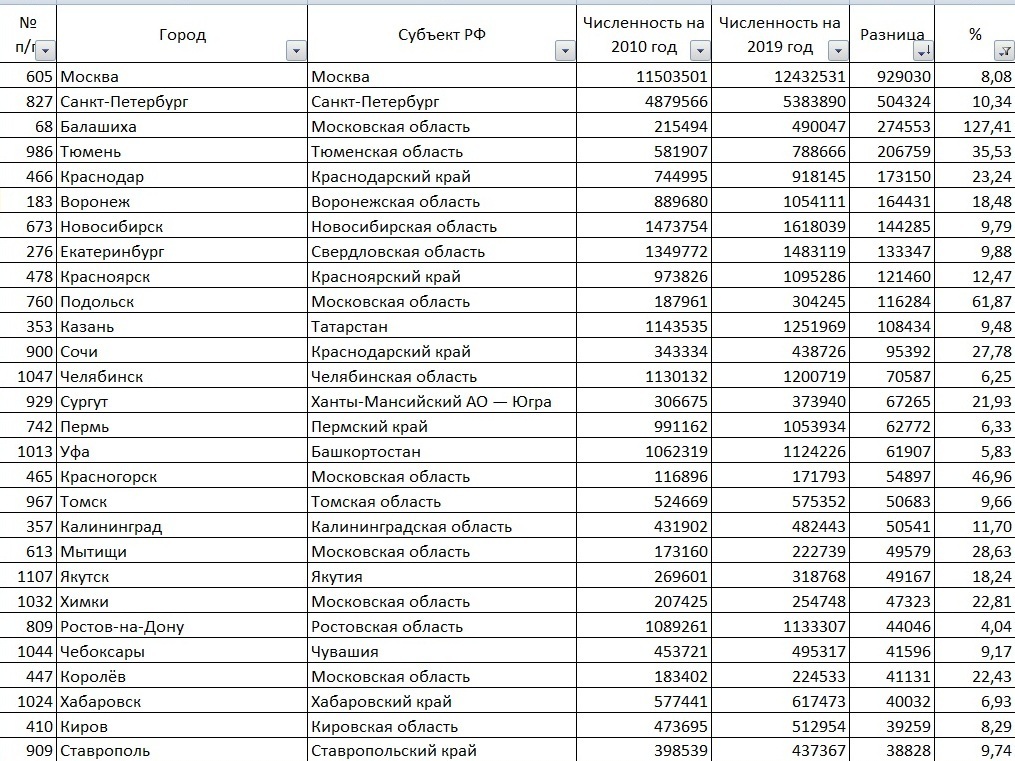 Лидеры и антилидеры по показателю абсолютной величины прироста населения (без учета "новых городов":