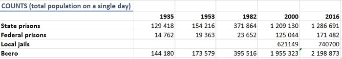 3) Теперь о США. Проблема та же, что и со статистикой по СССР. И опять хвалю Росстат- спасибо, что свели все нынешние виды учреждений (СИЗО, тюрьмы, колонии) в одну таблицу. По США, как я понял, три основных вида учреждений- State prisons (тюрьмы штатов), Federal prisons (федеральные тюрьмы), Local jails (понял из определений, нечто похожее на СИЗО, учреждения под юрисдикцией местных администрацийкак "для содержания лиц ожидающих суда или совершивших незначительные преступления). Так вот на сайтах государственных ведомств натыкался на цифры по штатовским и федеральным тюрьмам (включая совсем свежие данные). Но вот источник где бы в одной таблице были одновременно даны все три вида учреждений (чтоб сравнивать с российскими можно было) нашел на сайте Prison Policy Initiative. Это общественная организация, но в пояснениях к таблицам указаны источником данных именно официальные государственные ведомства, так что цифраам можно доверять. Просто на данном сайте государственные цифры удобно совмещены. Правда данные заканчиваются 2016 годом, но повторюсь, зато полные. https://www.prisonpolicy.org/data/ Предлагаю пройти по ссылке- там содержится гигантская таблица с данными начиная с 1925 года. Я сюда размещу только "огрызок". Оставил годы когда у нас заканчивали Сталин и Брежнев, начинал Путин.