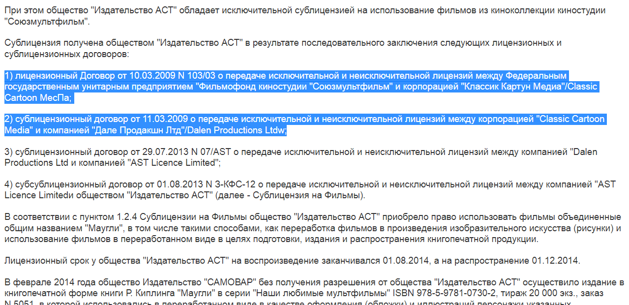 Ну, если этого недостаточно пороем глубже: как-то АСТ решил взъебать издательство Самовар за публикацию книги с персонажами Союзмультфильма... решение суда указывает на то что в 2009 году(sic! сделка по выкупу Усмановым фонда состоялась 3 сентября 2007 года) между неким "Classic Cartoon Media" были заключены лицензионные соглашения на безраздельное право использования чего-то там. Если же рассматривать все постановление суда, то речь идет о "Маугли", который входит в "золотую коллекцию"