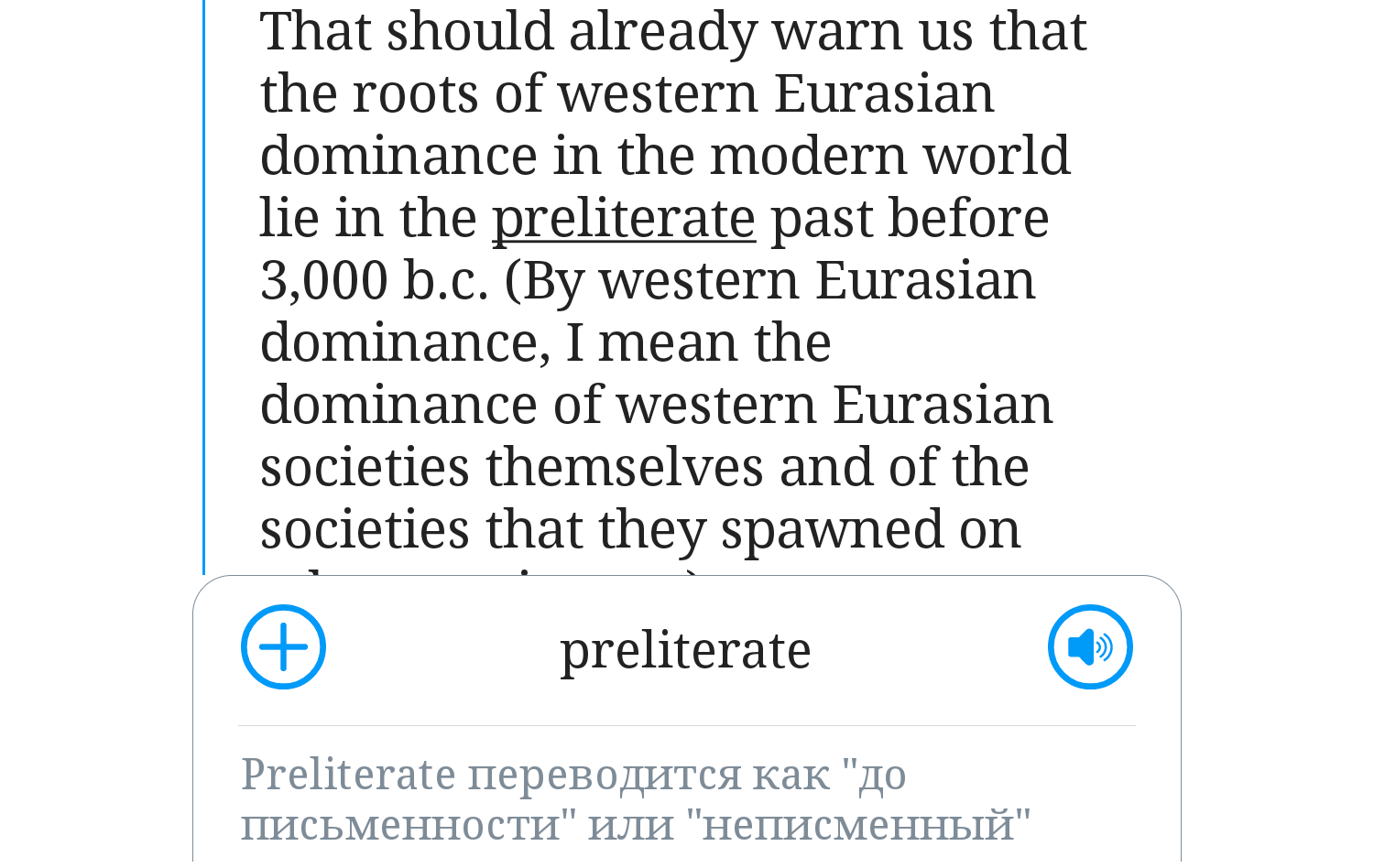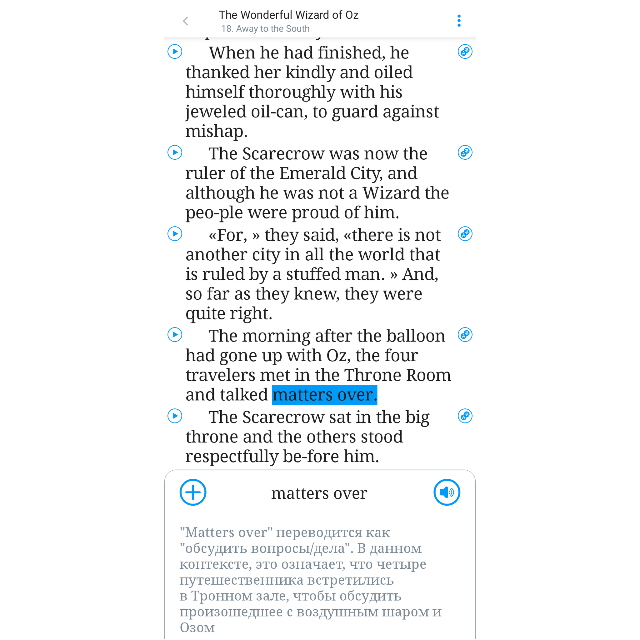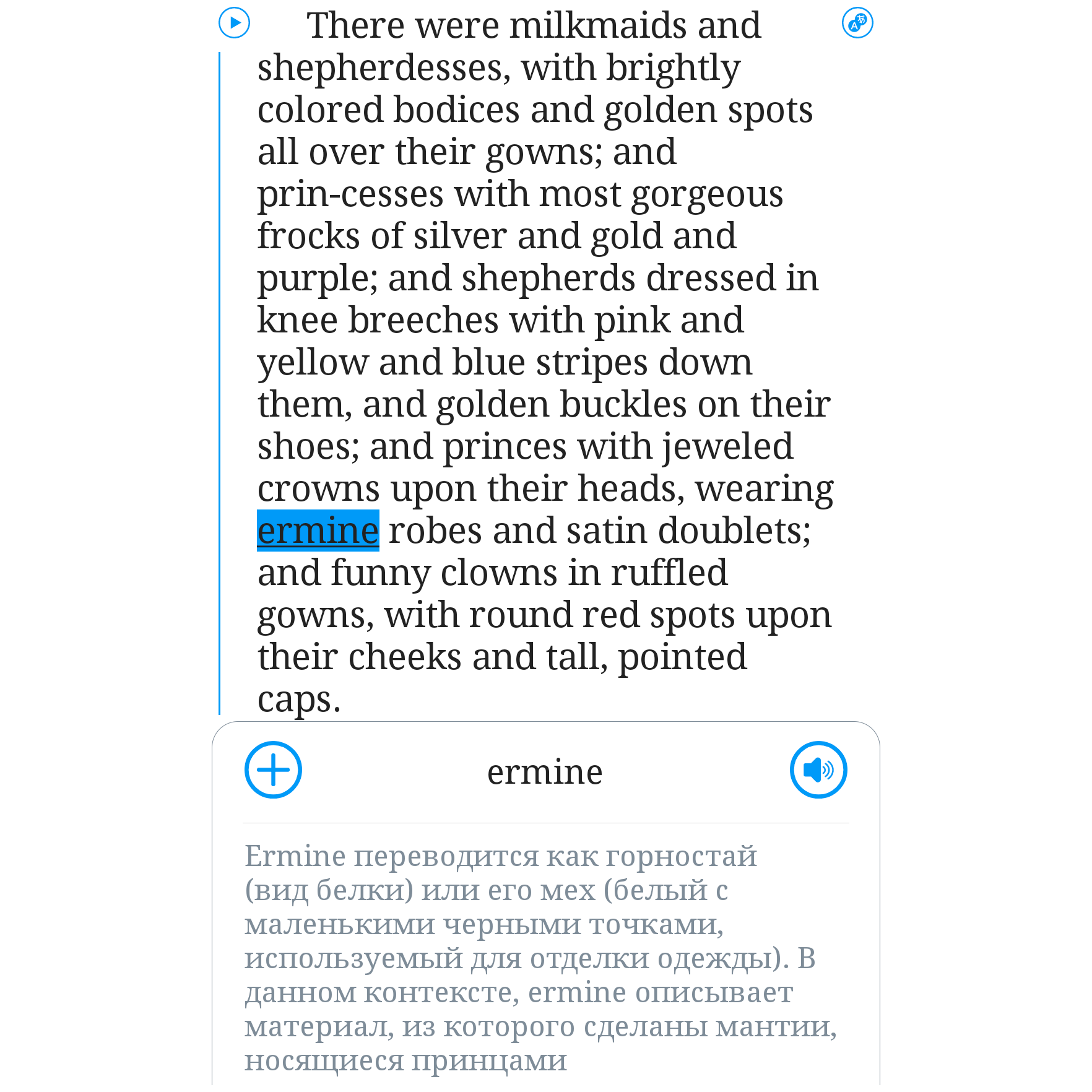 Я уже рассказывал о своем Smart Book здесь и здесь. Можно посмотреть минутный ролик, если лень читать. Если вкратце: я разрабатываю приложение для чтения книг в оригинале. В нем можно одним нажатием перевести любое слово, абзац или выделенный участок текста на любом языке. В приложении встроены разные сервисы перевода, чтобы пользователю не нужно было переключаться между приложениями переводчиков. Самая главная проблема при использовании этих сервисов в том, что при нажатии на слово пользователь получает полный набор переводов слова в отрыве от контекста.