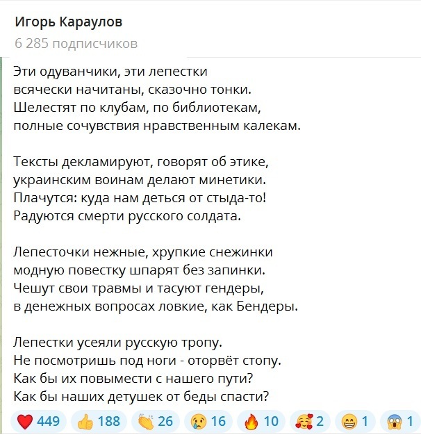 «Я далёк от идеи ввести заградительные пошлины на переводную книжную продукцию. Российские авторы должны работать в условиях конкуренции. Но в засилье переводной литературы на книжных полках, а значит, и в головах читателей ничего хорошего не вижу. Рейтинги торговых сетей показывают, что даже лидерами продаж становятся переводные книги, качество которых вызывает сомнение. Думаю, что сегмент массового чтения основательно забит именно низкопробной зарубежной литературой. Помимо того, что она плохо написана, она чаще всего ещё плохо переведена. Что ещё хуже, российские авторы сами начинают на эту макулатуру ориентироваться. Поэтому разумный протекционизм здесь необходим, в том числе и за счёт введения сборов с продаж такой продукции. Может быть, имеет смысл сделать исключение для зарубежной классики и иных полезных переводных книг. В результате государство получит дополнительный финансовый ресурс, который сможет потратить на стимулирование российской литературы, в том числе на перевод книг современных авторов и на их продвижение за рубежом», – сообщил Караулов.