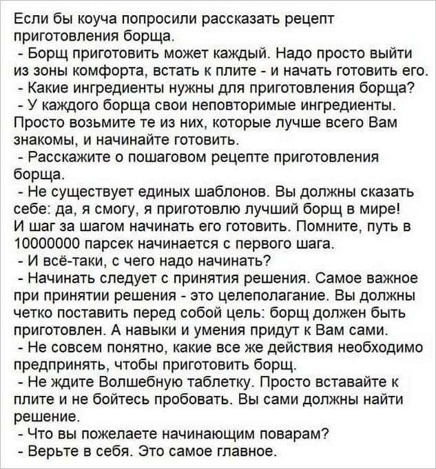 А если серьезно, то такой принцип рассчитан на тех, кому и так не надо обьяснять, что еду надо солить. А кода человек только учится, это "вы поймете, когда будет готово" ни фига не помогает. Я это блюдо никогда не видела и не пробовала, как я пойму-то?