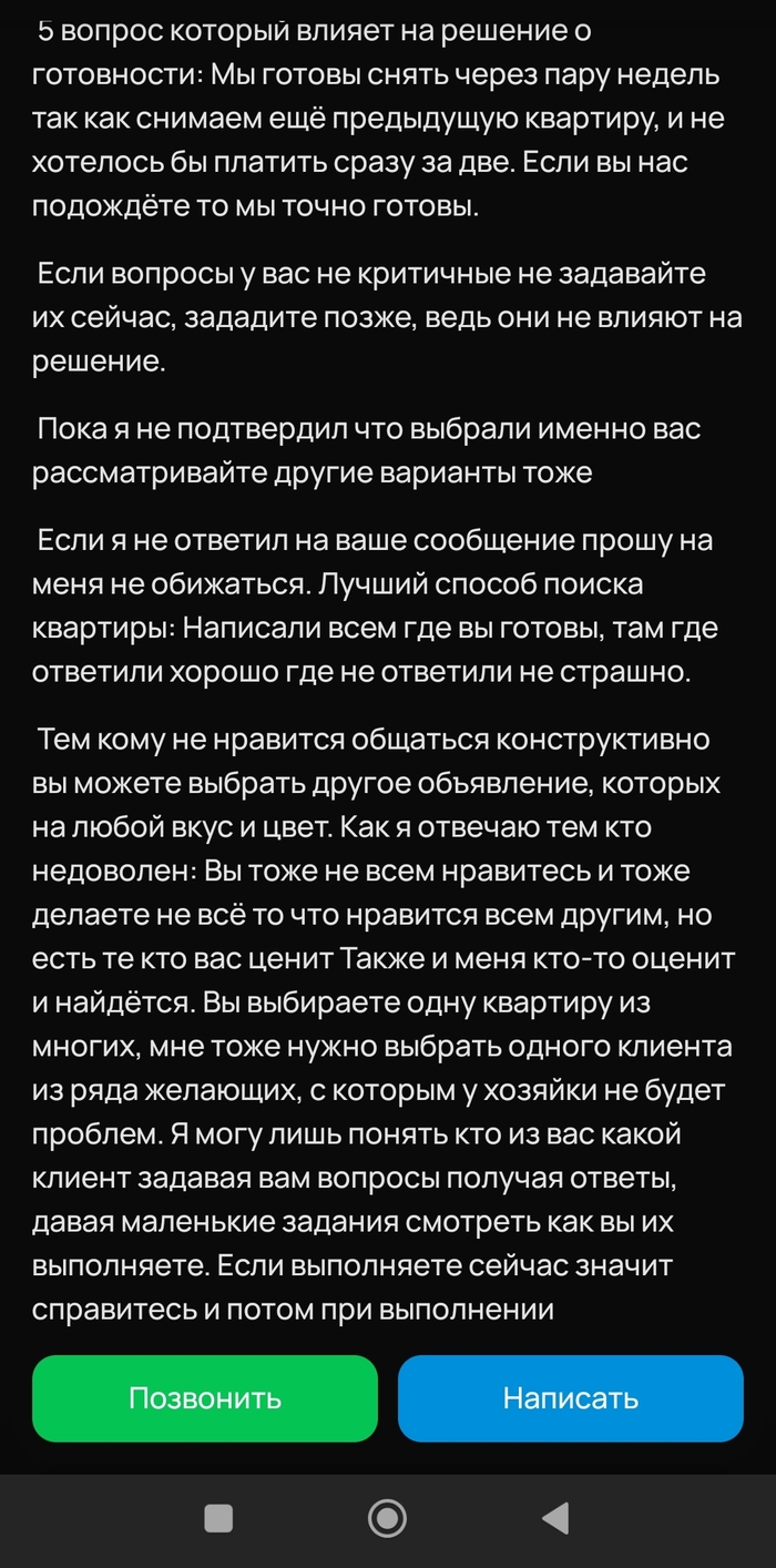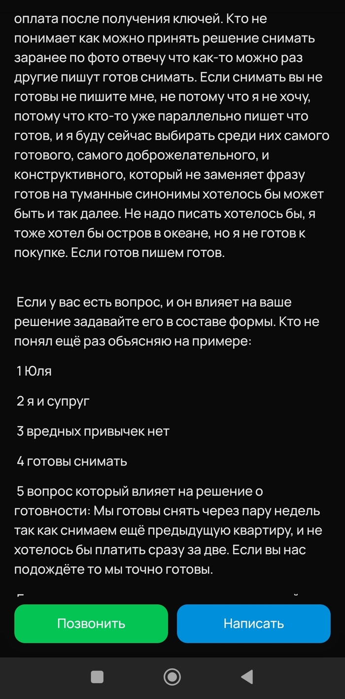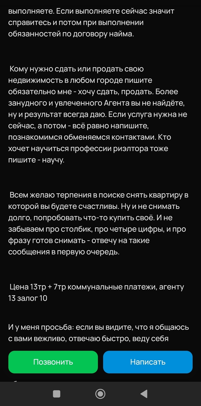 Контекст: находясь в поиске квартиры в аренду, просматриваю небезызвестный сайт с объявлениями. Очень многие, к моему удивлению, сдают квартиры через риелторские агенства, хотя, лично моё мнение, что с их работой может справиться фонарный столб (возможно, даже более эффективно), но не суть. В процессе поиска наткнулся на объявление с крайне необычным описанием, от которого слегка выпал в осадок.