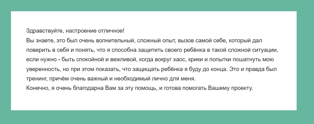 Закончу позитивным ответом от сопровождаемой мамы из основной истории: